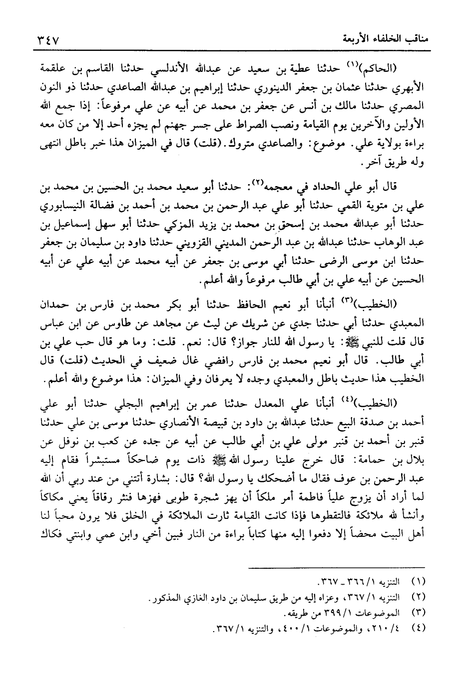 (الْحَاكِم) حَدَّثَنَا عَطِيَّة بْن سَعِيد عَن عَبْد الله الأندلسي حَدَّثَنَا الْقَاسِم بْن عَلْقَمَة الْأَبْهَرِيّ حَدَّثَنَا عُثْمَان بْن جَعْفَر الدينَوَرِي حَدَّثَنَا إِبْرَاهِيم بْن عَبْد الله الصاعدي حَدَّثَنَا ذُو النُّون الْمَصْرِيّ حَدَّثَنَا مَالك بْن أنس عَن جَعْفَر بْنِ مُحَمَّدٍ عَن أَبِيهِ عَن عَلِيٍّ مَرْفُوعا: إِذَا جَمَعَ اللَّهُ الأَوَّلِينَ وَالآخِرِينَ يَوْمَ الْقِيَامَةِ وَنَصَبَ الصِّرَاطَ عَلَى جَسْرِ جَهَنَّمَ لَمْ يَجُزْهُ أَحَدٌ إِلا مَنْ كَانَ مَعَهُ بَرَاءَةٌ بِوِلايَةِ عَلِيٍّ.