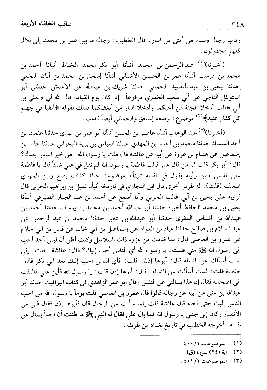 (أَخْبَرَنَا) عَبْد الْوَهَّاب أَنْبَأنَا عَاصِم بْن الْحَسَن أَنْبَأنَا أَبُو عُمَر بْن مهْدي حَدَّثَنَا عُثْمَان بن أَحْمد السماك حَدَّثَنَا مُحَمَّد بْن أَحْمَد بْن الْمهْدي حَدَّثَنَا الْعَبَّاس بْن يزِيد البحراني حَدَّثَنَا خَالِد بْن إِسْمَاعِيل عَن هِشَام بْن عُرْوَة عَن أَبِيه عَن عَائِشَة قَالَ قلتُ يَا رَسُول الله: مَنْ خَيْرُ النَّاسِ بَعْدَكَ؟ قَالَ: أَبُو بَكْرٍ قُلْتُ ثُمَّ مَنْ قَالَ عُمَرُ قَالَتْ فَاطِمَةُ يَا رَسُولَ اللَّهِ لَمْ تَقُلْ فِي عَلِيٍّ شَيْئًا قَالَ يَا فَاطِمَةُ عَلِيٌّ نَفْسِي فَمَنْ رَأَيْتِهِ يَقُولُ فِي نَفْسِهِ شَيْئًا، مَوْضُوع: خَالِد كَذَّاب يضعُ وَابْن الْمهْدي ضَعِيف (قلت) : لَهُ طَرِيق أُخْرَى قَالَ ابْن النجاري فِي تَارِيخه أَنْبَأنَا ثميل بْن إِبْرَاهِيم الْحَرْبِيّ قَالَ قُرِئ عَلَى يَحْيَى بْن أبي غَالب الْحَرْبِيّ وَأَنا أسمعُ عَن أَحْمَد بْن عَبْد الْجَبَّار الصَّيْرَفِي أَنْبَأنَا يَحْيَى بْن مُحَمَّد الْحَافِظ أخبرهُ حَدَّثَنَا أَبُو عَبْد الله أَحْمَد بْن مُحَمَّد بْن يُوسُف حَدَّثَنَا أَحْمَد بْن عبيد الله بن أشناس الْمقري حَدَّثَنَا أَبُو عَبْد الله بْن عفير حَدَّثَنَا مُحَمَّد بْن عَبْد الرَّحْمَن عَن عَبْد السَّلَام بْن صالِح حَدَّثَنَا عباد بْن الْعَوام عَن إِسْمَاعِيل بْن أَبِي خَالِد عَن قيس بْن أَبِي حَازِم عَن عَمْرو بن العَاصِي قَالَ: لَمَّا قَدِمْتُ مِنْ غَزْوَةِ ذَاتِ السُّلاسِلِ وَكُنْتُ أَظُنُّ أَنْ لَيْسَ أَحَدٌ أَحَبَّ إِلَى رَسُولِ الله مِنِّي فَقُلْتُ: يَا رَسُولَ اللَّهِ أَيُّ النَّاسِ أَحَبُّ إِلَيْكَ؟ قَالَ عَائِشَةُ.