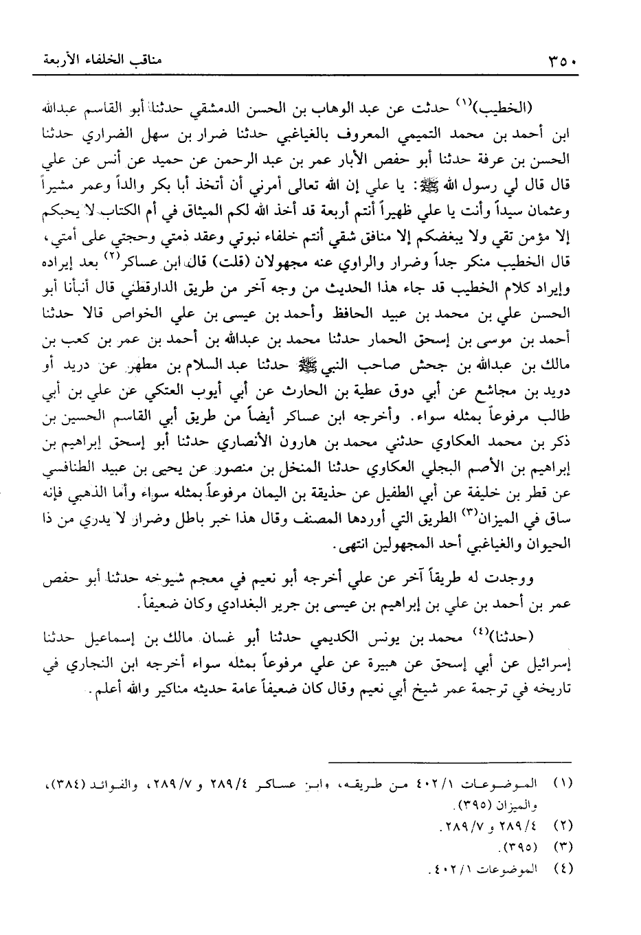 (الْخَطِيب) حدثت عَن عَبْد الْوَهَّاب بْن الْحَسَن الدِّمَشْقِي حَدَّثَنَا أَبُو الْقَاسِم عبد الله ابْن أَحْمَد بْن مُحَمَّد التَّمِيمِي الْمَعْرُوف بالغياغبي حَدَّثَنَا ضرار بْن سهل الضراري حَدَّثَنَا الْحَسَن بْن عَرَفَة حَدَّثَنَا أَبُو حَفْص الأبّار عُمَر بْن عَبْد الرَّحْمَن عَن حميد عَن أنس عَنْ عَلِيٍّ قَالَ قَالَ لي رَسُول الله: يَا عَلِيُّ إِنَّ اللَّهَ تَعَالَى أَمَرَنِي أَنْ أَتَّخِذَ أَبَا بَكْرٍ وَالِدًا وَعُمَرَ مُشِيرًا وَعُثْمَانَ سَيِّدًا وَأَنْتَ يَا عَلِيُّ ظَهِيرًا أَنْتُمْ أَرْبَعَةٌ قَدْ أَخَذَ اللَّهُ لَكُمُ الْمِيثَاقَ فِي أُمِّ الْكتاب لَا يُحِبُّكُمُ إِلا مُؤْمِنٌ تَقِيٌّ وَلا يَبْغُضُكُمْ إِلا مُنَافِقٌ شَقِيٌّ أَنْتُمْ خُلَفَاءُ نُبُوَّتِي وَعَقْدُ ذِمَّتِي وَحُجَّتِي عَلَى أُمَّتِي، قَالَ الْخَطِيب مُنكر جدًّا وَضِرَار والراوي عَنْهُ مَجْهُولَانِ (قلت) قَالَ ابْن عَسَاكِر بعد إِيرَاده وإيراد كَلَام الْخَطِيب قد جَاءَ هَذَا الحَدِيث من وَجه آخر من طَرِيق الدَّارَقُطْنِيّ قَالَ أَنْبَأنَا أَبُو الْحَسَن عَلِيّ بْن مُحَمَّد بْن عُبَيْد الْحَافِظ وَأَحْمَد بْن عِيسَى بْن عَليّ الْخَواص قَالَا حَدَّثَنَا أَحْمَد بْن مُوسَى بْن إِسْحَاق الْحمار حَدَّثَنَا مُحَمَّد بْن عَبْد الله بْن أَحْمَد بْن عُمَر بْن كَعْب بْن مَالك بْن عَبْد الله بْن جحش صَاحب النَّبِي حَدَّثَنَا عَبْد السَّلَام بْن مطهر عَن دُرَيْد أَو دويد بْن مجاشع عَن أبي دوق عَطِيَّة بْن الْحَارِث عَن أبي أَيُّوب الْعَتكِي عَن عَلِيّ بْن أبي طَالب مَرْفُوعا بِمثله سَوَاء.