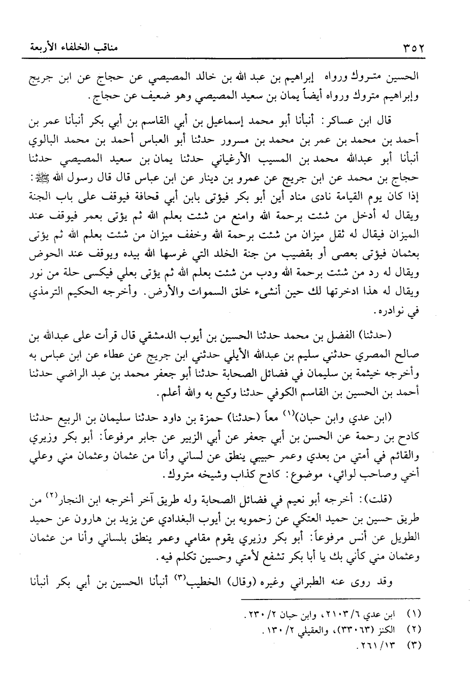 قَالَ ابْن عَسَاكِر: أَنْبَأنَا أَبُو مُحَمَّد إِسْمَاعِيل بْن أبي الْقَاسِم بْن أبي بَكْر أَنْبَأنَا عُمَر بْن أَحْمَد بْن مُحَمَّد بْن عُمَر بْن مُحَمَّد بْن مسرور حَدَّثَنَا أَبُو الْعَبَّاس أَحْمَد بْن مُحَمَّد البالوي أَنْبَأنَا أَبُو عَبْد الله مُحَمَّد بْن الْمسيب الأرغياني حَدَّثَنَا يَمان بْن سَعِيد المصِّيصِي حَدَّثَنَا حجاج بْن مُحَمَّد عَن ابْن جريج عَن عَمْرو بْن دِينَار عَن ابْن عَبَّاس قَالَ قَالَ رَسُول الله: إِذَا كَانَ يَوْمَ الْقِيَامَةِ نَادَى مُنَادٍ أَيْنَ أَبُو بَكْرٍ فَيُؤْتَى بِابْنِ أَبِي قُحَافَةَ فَيُوقَفُ عَلَى بَابِ الْجَنَّةِ وَيُقَالُ لَهُ أَدْخِلْ مَنْ شِئْتَ بِرَحْمَةِ اللَّهِ وَامْنَعْ مَنْ شِئْتَ بِعِلْمِ اللَّهِ ثُمَّ يُؤْتَى بِعُمَرَ فَيُوقَفُ عِنْدَ الْمِيزَانِ فَيُقَالُ لَهُ ثَقِّلْ مِيزَانَ مَنْ شِئْتَ بِرَحْمَةِ اللَّهِ وَخَفِّفْ مِيزَانَ مَنْ شِئْتَ بِعِلْمِ اللَّهِ ثُمَّ يُؤْتى بعثمان فَيُؤتى بعصى أَوْ بِقَضِيبٍ مِنْ جَنَّةِ الْخُلْدِ الَّتِي غَرَسَهَا اللَّهُ بِيَدِهِ وَيُوقَفُ عِنْدَ الْحَوْضِ وَيُقَالُ لَهُ رِدْ من شِئْت برحمة الله ودب مَنْ شِئْتَ بِعِلْمِ اللَّهِ ثُمَّ يُؤْتَى بِعَلِيٍّ فَيُكْسَى حُلَّةً مِنْ نور وَيُقَال لَهُ هَذَا ادَّخَرْتُهَا لَكَ حِينَ أُنْشِئَ خَلْقُ السَّمَوَات وَالأَرْضِ.