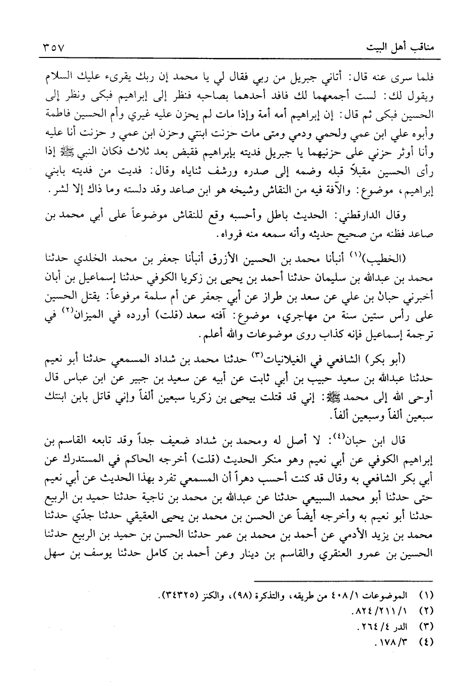 فَلَمَّا سُرِّيَ عَنْهُ قَالَ: أَتَانِي جِبْرِيلُ مِنْ رَبِّي فَقَالَ لِي يَا مُحَمَّدُ إِنَّ رَبَّكَ يُقْرِئُ عَلَيْكَ السَّلامَ وَيَقُولُ لَكَ: لَسْتُ أَجْمَعُهُمَا لَكَ فَافْدِ أَحَدَهُمَا بِصَاحِبِهِ فَنَظَرَ إِلَى إِبْرَاهِيمَ فَبَكَى وَنَظَرَ إِلَى الْحُسَيْنِ فَبَكَى ثُمَّ قَالَ: إِنَّ إِبْرَاهِيمَ أُمُّهُ أَمَةٌ وَإِذَا مَاتَ لَمْ يَحْزَنْ عَلَيْهِ غَيْرِي وَأُمُّ الْحُسَيْنِ فَاطِمَةُ وَأَبُوهُ عَلِيٌّ ابْن عَمِّي وَلَحْمِي وَدَمِي وَمَتَى مَاتَ حَزِنَتِ ابْنَتِي وَحَزِنَ ابْنُ عَمِّي وَحَزِنْتُ أَنَا عَلَيْهِ وَأَنَا أُوثِرُ حُزْنِي عَلَى حُزْنَيْهِمَا يَا جِبْرِيلُ فَدَيْتُهُ بِإِبْرَاهِيمَ فَقُبِضَ بَعْدَ ثَلاثٍ فَكَانَ النَّبِي إِذَا رَأَى الْحُسَيْنَ مُقْبِلا قَبَّلَهُ وَضَمَّهُ إِلَى صَدْرِهِ وَرَشَفَ ثَنَايَاهُ وَقَالَ: فَدَيْتُ من فديته بِابْنِي إِبْرَاهِيمَ، مَوْضُوع: والآفة فِيهِ من النقاش وَشَيْخه هُوَ ابْن صاعد وَقد دلسته وَمَا ذَاك إِلَّا لشر.
