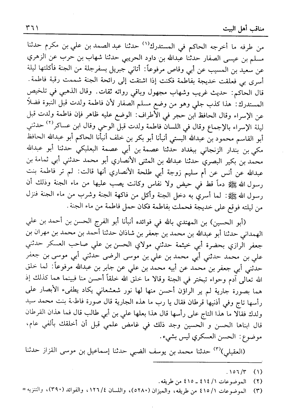 وَقَالَ الذَّهَبِيّ فِي تَلْخِيص الْمُسْتَدْرك: هَذَا كذب جلي وَهُوَ من وضع مُسْلِم الصفار لِأَن فَاطِمَة ولدت قبل النُّبُوَّة فضلا عَن الْإِسْرَاء وَقَالَ الْحَافِظ ابْن حجر فِي الْأَطْرَاف: الْوَضع عَلَيْهِ ظَاهر فَإِن فَاطِمَة ولدت قبل لَيْلَة الْإِسْرَاء بِالْإِجْمَاع وَقَالَ فِي اللِّسَان فَاطِمَة ولدت قبل الْوَحْي وَقَالَ ابْن عَسَاكِر حدَّثَنِي أَبُو الْقَاسِم مَحْمُود بْن عَبْد الله البستي أَنْبَأنَا أَبُو بَكْر بْن خلف أَنْبَأنَا الْحَاكِم أَبُو عَبْد الله الْحَافِظ مكي بْن بنْدَار الزنجاني بِبَغْدَاد حَدَّثَنَا عصمَة بْن أبي عصمَة البعلبكي حَدَّثَنَا أَبُو عَبْد الله مُحَمَّد بْن بكير الْبَصْرِيّ حَدَّثَنَا عَبْد الله بْن الْمثنى الْأنْصَارِيّ أَبُو مُحَمَّد حدَّثَنِي أبي ثُمَامَة بْن عَبْد الله عَن أنس عَنْ أُمِّ سُلَيْمٍ زَوْجَةِ أَبِي طَلْحَةَ الأَنْصَارِيِّ أَنَّهَا قَالَتْ: لَمْ تَرَ فَاطِمَةُ بنت رَسُول الله دَمًا قَطُّ فِي حَيْضٍ وَلا نِفَاسٍ وَكَانَتْ يُصَبُّ عَلَيْهَا مِنْ مَاءِ الْجَنَّةِ وَذَلِكَ أَنَّ رَسُولَ الله: لَمَّا أُسْرِيَ بِهِ دَخَلَ الْجَنَّةَ وَأكل من فَاكِهَة الْجنَّة وَشرب من مَاء الْجنَّة فَنزل من ليلته فَوَقع عَلَى خَدِيجَة فَحملت بفاطمة فَكَانَ حمل فَاطِمَة مِنْ مَاء الْجنَّة.