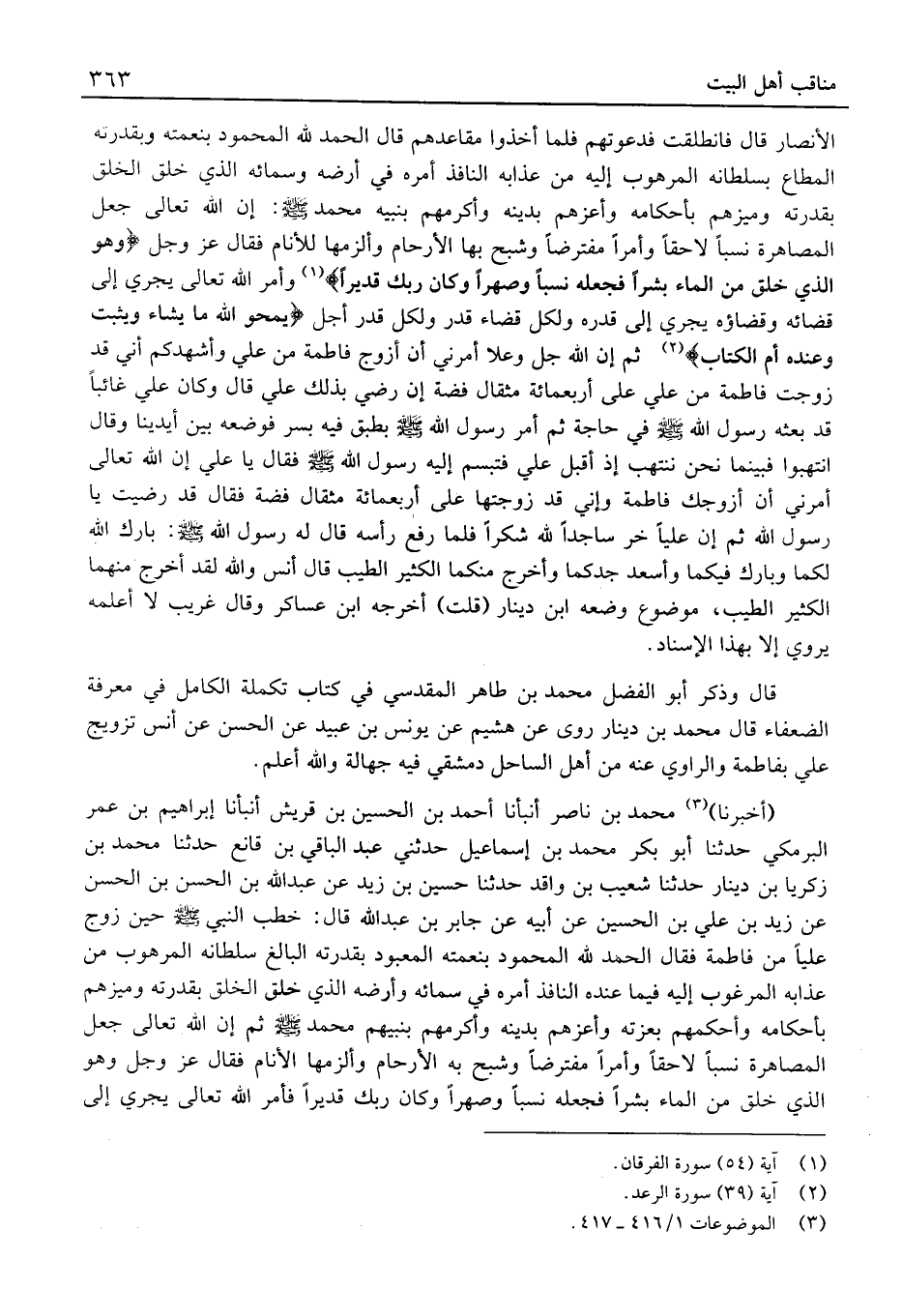 (أَخْبَرَنَا) مُحَمَّد بْن نَاصِر أَنْبَأنَا أَحْمَد بْن الْحُسَيْن بْن قُرَيْش أَنْبَأنَا إِبْرَاهِيم بْن عُمَر الْبَرْمَكِي حَدَّثَنَا أَبُو بَكْر مُحَمَّد بْن إِسْمَاعِيل حدَّثَنِي عَبْد الْبَاقِي بْن قَانِع حَدَّثَنَا مُحَمَّد بْن زَكَرِيَّا بْن دِينَار حَدَّثَنَا شُعَيْب بْن وَاقد حَدَّثَنَا حُسَيْن بْن زيد عَن عَبْد الله بْن الْحَسَن بْن الْحَسَن عَن زيد بْن عَلِيّ بْن الْحُسَيْن عَن أَبِيهِ عَنْ جَابِر بْن عَبْد الله قَالَ: خَطَبَ النَّبِي حِينَ زَوَّجَ عَلِيًّا مِنْ فَاطِمَةَ فَقَالَ الْحَمْدُ لِلَّهِ الْمَحْمُودِ بِنِعْمَتِهِ الْمَعْبُودِ بِقُدْرَتِهِ الْبَالِغِ سُلْطَانُهُ الْمَرْهُوبِ مِنْ عَذَابِهِ الْمَرْغُوبِ إِلَيْهِ فِيمَا عِنْدَهُ النَّافِذِ أَمْرُهُ فِي سَمَائِهِ وَأَرْضِهِ الَّذِي خَلَقَ الْخَلْقَ بِقُدْرَتِهِ وَمَيَّزَهُمْ بِأَحْكَامِهِ وَأَحْكَمَهُمْ بِعِزَّتِهِ وَأَعَزَّهُمْ بِدِينِهِ وَأكْرمهمْ بِنَبِيِّهِمْ مُحَمَّد ثُمَّ إِنَّ اللَّهَ تَعَالَى جَعَلَ الْمُصَاهَرَةَ نَسَبًا لاحِقًا وَأَمْرًا مُفْتَرَضًا وَشَبَّحَ بِهِ الأَرْحَامَ وَأَلْزَمَهَا الأَنَامَ فَقَالَ عَزَّ وَجَلَّ وَهُوَ الَّذِي خَلَقَ مِنَ الْمَاءِ بَشَرًا فَجَعَلَهُ نَسَبًا وَصِهْرًا وَكَانَ رَبُّكَ قَدِيرًا فَأَمْرُ اللَّهِ تَعَالَى يَجْرِي إِلَى