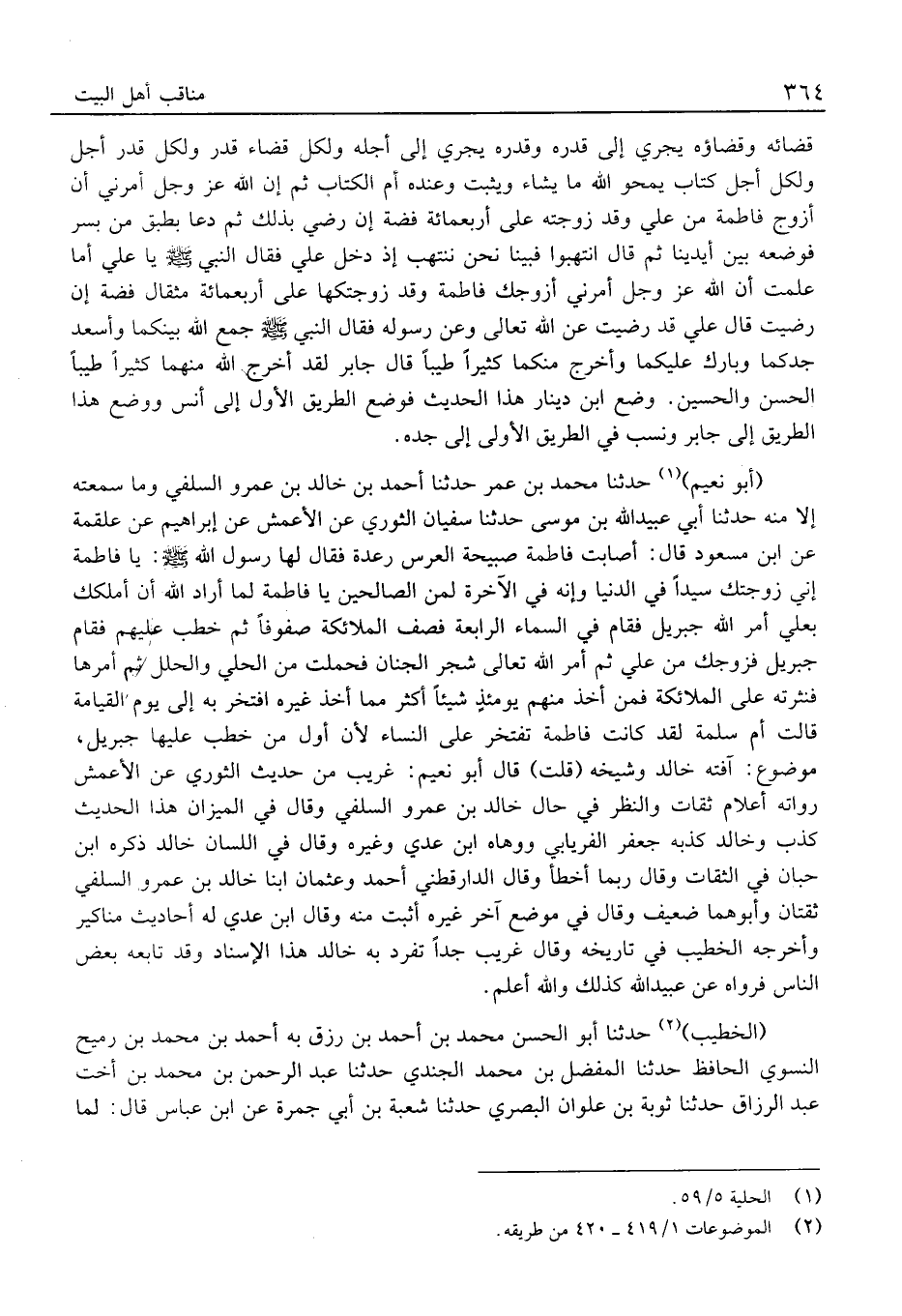 (أَبُو نُعَيْم) حَدَّثَنَا مُحَمَّد بن عمر حَدَّثَنَا أَحْمَد بْن خَالِد بْن عَمْرو السلَفِي وَمَا سمعته إِلَّا مِنْهُ حَدثنَا أبي عُبَيْد الله بْن مُوسَى حَدَّثَنَا سُفْيَان الثَّوْريّ عَن الْأَعْمَش عَن إِبْرَاهِيم عَن عَلْقَمَة عَنِ ابْنِ مَسْعُودٍ قَالَ: أَصَابَتْ فَاطِمَةَ صَبِيحَةَ الْعُرْسِ رِعْدَةٌ فَقَالَ لَهَا رَسُولُ الله: يَا فَاطِمَةُ إِنِّي زَوَّجْتُكِ سَيِّدًا فِي الدُّنْيَا وَإِنَّهُ فِي الآخِرَةِ لِمَنِ الصَّالِحِينَ يَا فَاطِمَةُ لَمَّا أَرَادَ اللَّهُ أَنْ أُمَلِّكَكِ بِعَلِيٍّ أَمَرَ اللَّهُ جِبْرِيلَ فَقَامَ فِي السَّمَاءِ الرَّابِعَةِ فَصَفَّ الْمَلائِكَةَ صُفُوفًا ثُمَّ خَطَبَ عَلَيْهِمْ فَقَامَ جِبْرِيلُ فَزَوَّجَكَ مِنْ عَلِيٍّ ثُمَّ أَمَرَ اللَّهُ تَعَالَى شَجَرَ الْجِنَانِ فَحَمَلَتْ مِنَ الْحُلِيِّ وَالْحُلَلِ ثُمَّ أَمَرَهَا فَنَثَرَتْهُ عَلَى الْمَلائِكَةِ فَمَنْ أَخَذَ مِنْهُمْ يَوْمَئِذٍ شَيْئًا أَكْثَرَ مِمَّا أَخَذَ غَيْرُهُ افْتَخَرَ بِهِ إِلَى يَوْمِ الْقِيَامَةِ قَالَتْ أُمُّ سَلَمَةَ لَقَدْ كَانَتْ فَاطِمَةُ تَفْتَخِرُ عَلَى النِّسَاءِ لأَنَّ أَوَّلَ مَنْ خَطَبَ عَلَيْهَا جِبْرِيلُ، مَوْضُوع: آفته خَالِد وَشَيْخه (قلت) قَالَ أَبُو نُعَيْم: غَرِيبٌ مِنْ حَدِيثِ الثَّوْرِيِّ عَن الْأَعْمَش رُوَاته أَعْلَام ثِقَات وَالنَّظَر فِي حَال خَالِد بْن عَمْرو السلَفِي وَقَالَ فِي الْمِيزَان هَذَا الحَدِيث كذب وخَالِد كذبه جَعْفَر الْفرْيَابِيّ ووهاه ابْن عدي وَغَيره وَقَالَ فِي اللِّسَان خَالِد ذكره ابْن حبَان فِي الثِّقَات وَقَالَ رُبمَا أَخطَأ وقَالَ الدَّارَقُطْنِيّ أَحْمَد وَعُثْمَان ابْنا خَالِد بْن عَمْرو السلَفِي ثقتان وأبوهما ضَعِيف وَقَالَ فِي مَوضِع آخر غَيره أثبت مِنْهُ وَقَالَ ابْن عدي لَهُ أَحَادِيث مَنَاكِير وَأخرجه الْخَطِيب فِي تَارِيخه وَقَالَ غَرِيب جدًّا تفرد بِهِ خَالِد هَذَا الْإِسْنَاد وَقد تَابعه بعض النَّاس فرواهُ عَن عُبَيْد الله كَذَلِك وَالله أعلم.