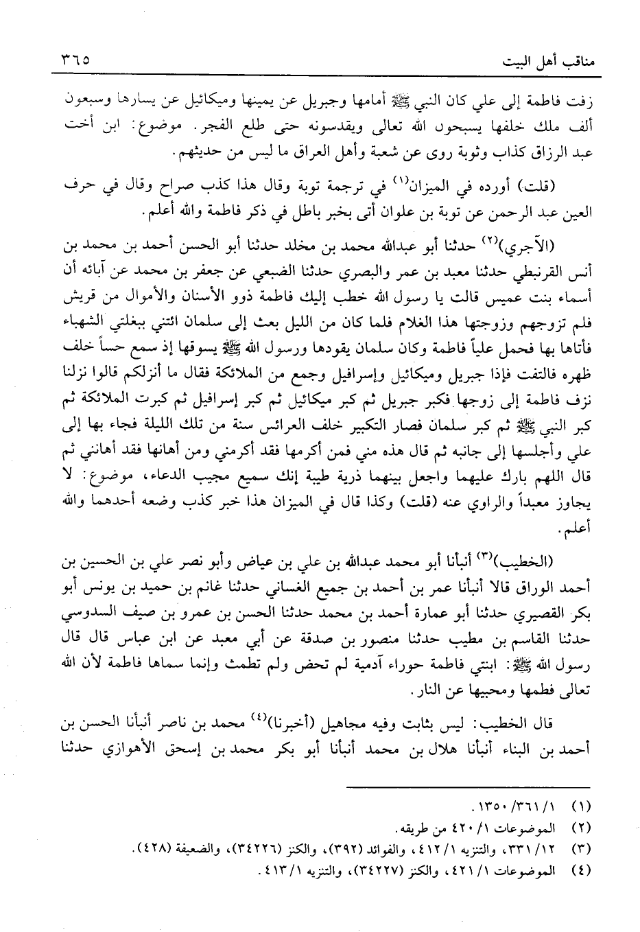 (الْخَطِيب) أَنْبَأنَا أَبُو مُحَمَّد عَبْد الله بْن عَلِيّ بْن عِيَاض وَأَبُو نصر عَلِيّ بْن الْحُسَيْن بْن أَحْمَد الْوراق قَالَا أَنْبَأنَا عُمَر بْن أَحْمَد بْن جَمِيع الغساني حَدَّثَنَا غانِم بْن حميد بْن يُونُس أَبُو بَكْر القصيري حَدَّثَنَا أَبُو عمَارَة أَحْمَد بْن مُحَمَّد حَدَّثَنَا الْحَسَن بْن عَمْرو بْن صيف السدُوسِي حَدَّثَنَا الْقَاسِم بْن مُطيب حَدَّثَنَا مَنْصُور بْن صَدَقَة عَن أبي معبد عَن ابْن عَبَّاس قَالَ قَالَ رَسُول الله: ابْنَتي فَاطِمَة حوراء آدمية لَمْ تَحض ولَمْ تطمث وإنّما سَماها فَاطِمَة لِأَن الله تَعَالَى فطمها ومحبيها عَن النَّار.