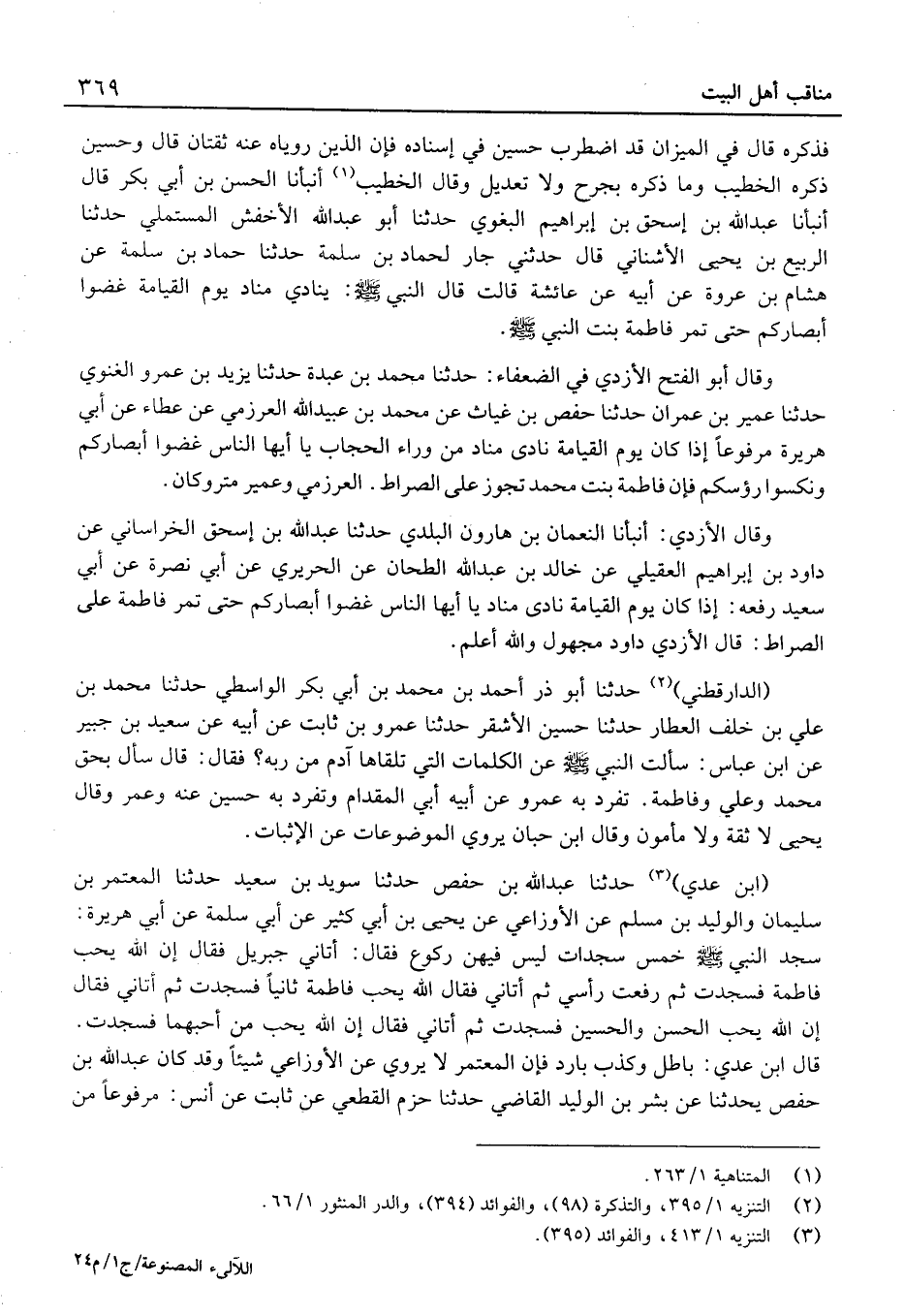 فَذكره قَالَ فِي الْمِيزَان قد اضْطربَ حُسَيْن فِي إِسْنَاده فَإِن الَّذين روياه عَنْهُ ثقتان قَالَ وحسين ذكره الْخَطِيب وَمَا ذكره بِجرح وَلَا تَعْدِيل وَقَالَ الْخَطِيب أَنْبَأنَا الْحَسَن بْن أَبِي بَكْر قَالَ أَنْبَأنَا عَبْد الله بْن إِسْحَاق بْن إِبْرَاهِيم الْبَغَوِيّ حَدَّثَنَا أَبُو عَبْد الله الْأَخْفَش الْمُسْتَمْلِي حَدَّثَنَا الرّبيع بْن يَحْيَى الْأُشْنَانِي قَالَ حدَّثَنِي جَار لحماد بْن سَلمَة حَدَّثَنَا حَمّاد بْن سَلمَة عَن هِشَام بْن عُرْوَة عَن أَبِيهِ عَن عَائِشَةَ قَالَتْ قَالَ النَّبِي: يُنادي مُنَاد يَوْم الْقِيَامَة غضوا أبصاركم حَتَّى تَمر فَاطِمَة بِنْت النَّبِي.