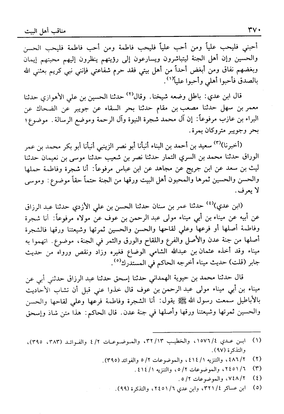 (أَخْبَرَنَا) سَعِيد بْن أَحْمَد بْن الْبناء أَنْبَأنَا أَبُو نصر الزَّيْنَبِي أَنْبَأنَا أَبُو بَكْر مُحَمَّد بْن عُمَر الْوراق حَدَّثَنَا مُحَمَّد بْن السّري التَّمار حَدَّثَنَا نصر بْن شُعَيْب حَدَّثَنَا مُوسَى بْن نعيمان حَدَّثَنَا لَيْث بْن سعد عَن ابْن جريج عَن مُجَاهِد عَنِ ابْنِ عَبَّاسٍ مَرْفُوعا: أَنَا شَجَرَة وَفَاطِمَة حملهَا وَالْحسن وَالْحُسَيْن ثَمرها والمحبون أهل الْبَيْت وَرقهَا من الْجنَّة حتما حَقًا مَوْضُوع: ومُوسَى لَا يعرف.