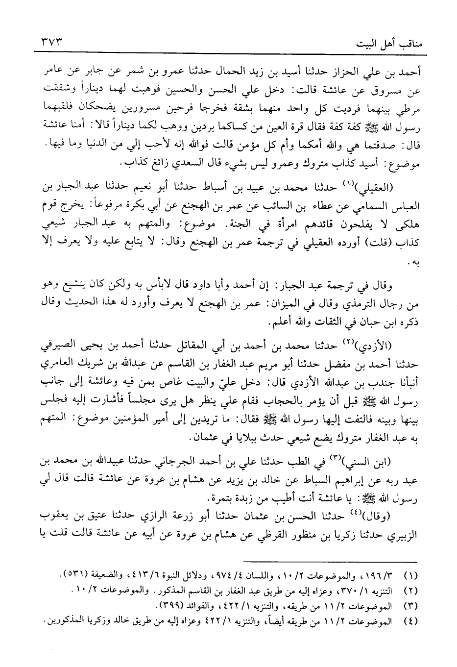 (الْأزْدِيّ) حَدَّثَنَا مُحَمَّد بْن أَحْمَد بْن أبي الْمقَاتل حَدَّثَنَا أَحْمَد بْن يَحْيَى الصَّيْرَفِي حَدَّثَنَا أَحْمَد بْن مفضل حَدَّثَنَا أَبُو مَرْيَم عَبْد الْغفار بْن الْقَاسِم عَن عَبْد الله بْن شريك العامري أَنْبَأنَا جُنْدُب بْن عَبْد الله الْأزْدِيّ قَالَ: دخل عَليّ وَالْبَيْت غاص بِمن فِيهِ وَعَائِشَة إِلَى جَانب رَسُول الله قبل أَن يُؤمر بالحجاب فَقَامَ عَليّ ينظرُ هَلْ يرى مَجْلِسا فَأَشَارَتْ إِلَيْهِ فَجَلَسَ بَينهَا وَبَينه فَالْتَفت إِلَيْهَا رَسُول الله فَقَالَ: مَا تريدين إِلَى أَمِير الْمُؤمنِينَ مَوْضُوع: الْمُتَّهم بِهِ عَبْد الْغفار مَتْرُوك يضعُ شيعي حَدَّث ببلايا فِي عُثْمَان.
