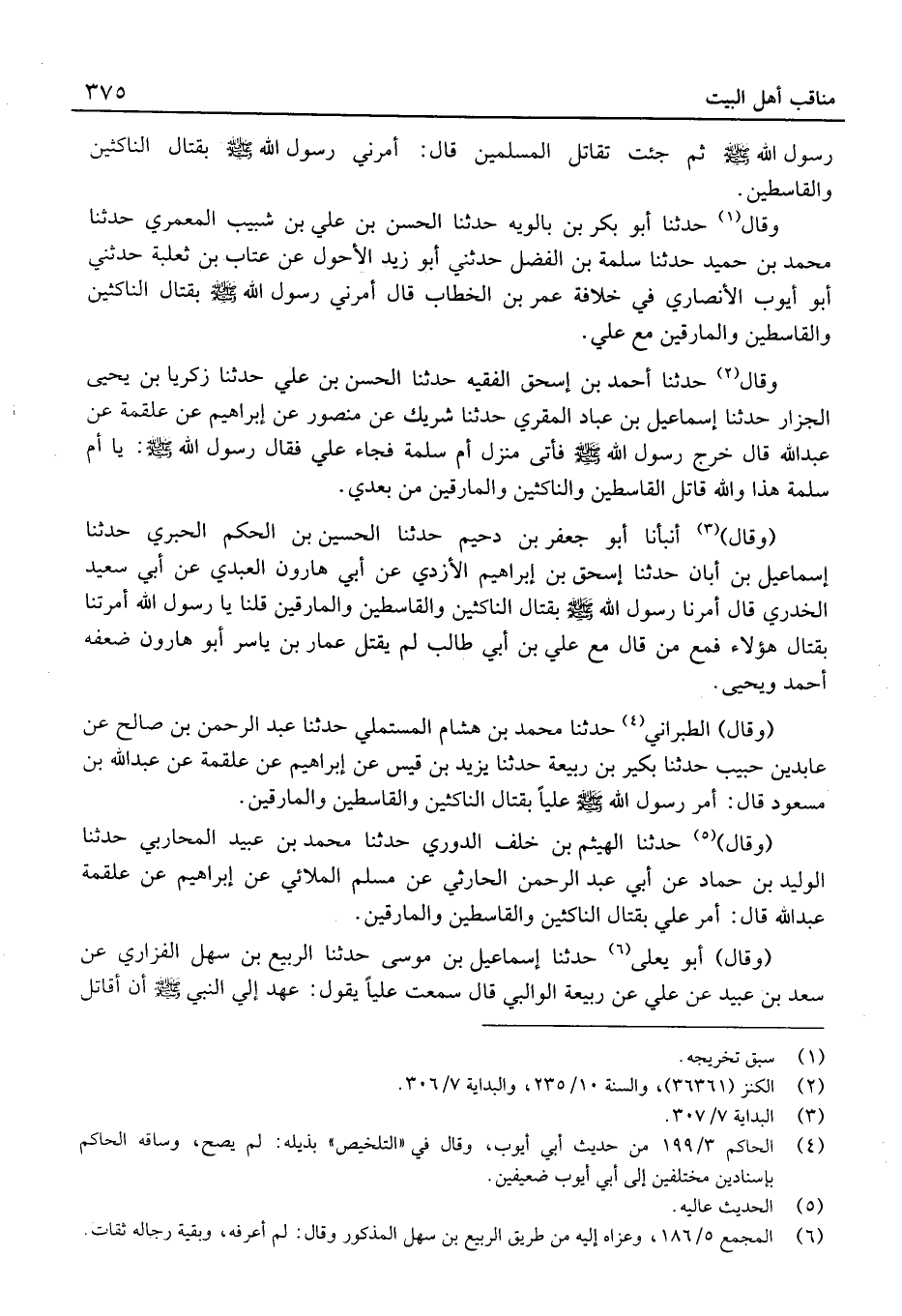 (وَقَالَ) حَدَّثَنَا الْهَيْثَم بْن خلف الدوري حَدَّثَنَا مُحَمَّد بْن عُبَيْد الْمحَاربي حَدَّثَنَا الْوَلِيد بْن حَمَّاد عَن أبي عَبْد الرَّحْمَن الْحَارِثِيّ عَن مُسْلِم الْملَائي عَن إِبْرَاهِيم عَن عَلْقَمَة عَبْد الله قَالَ: أَمر عَليّ بِقِتَال النَّاكِثِينَ والقاسطين والمارقين.