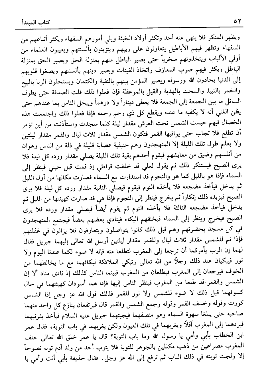 وَيَظْهَرُ الْمُنْكَرُ فَلا يَنْهَى عَنْهُ أَحَدٌ وَتَكْثُرُ أَوْلادُ الْخَبَثَةِ وَيْلِي أُمُورَهُمُ السُّفَهَاءُ وَيَكْثُرُ أَتْبَاعَهُم مِنَ السُّفَهَاء وَتظهر فيهم الأباطيل يتعاونون عَلَى رِيَبِهِمْ وَيَتَزَيَّنُونَ بِأَلْسِنَتِهِمْ وَيَعِيبُونَ الْعُلَمَاءَ مِنْ أُولِي الأَلْبَابِ وَيَتَّخِذُونَهُمْ سُخْرِيًّا حَتَّى يَصِيرَ الْبَاطِلُ مِنْهُمْ بِمَنْزِلَةِ الْحَقِّ وَيَصِيرَ الْحَقُّ بِمَنْزِلَةِ الْبَاطِلِ وَيَكْثُرَ فِيهِمْ ضَرْبُ الْمَعَازِفِ وَاتِّخَاذُ الْقَيْنَاتِ وَيَصِيرَ دِينُهُمْ بِأَلْسِنَتِهِمْ ويصغوا قُلُوبَهُمْ إِلَى الدُّنْيَا يُحَادُّونَ اللَّهَ وَرَسُولَهُ وَيَصِيرَ الْمُؤْمِنُ بَيْنَهُمُ بِالنَّقِيَّةِ وَالْكِتْمَانِ وَيَسْتَحِلُّونَ الرِّبَا بِالْبَيْعِ وَالْخَمْرَ بِالنَّبِيذِ وَالسُّحْتَ بِالْهَدِيَّةِ وَالْقِيلَ بِالْمَوْعِظَةِ فَإِذَا فَعَلُوا ذَلِكَ قَلَّتِ الصَّدَقَةُ حَتَّى يَطُوفَ السَّائِلُ مَا بَيْنَ الْجُمُعَةِ إِلَى الْجُمُعَةِ فَلا يُعْطَى دِينَارًا وَلا دِرْهَمًا وَيَبْخَلَ النَّاسُ بِمَا عِنْدَهُمْ حَتَّى يَظُنَّ الْغَنِيُّ أَنَّهُ لَا يَكْفِيهُ مَا عِنْدَهُ وَيَقْطَعَ كُلُّ ذِي رَحِمٍ رَحِمَهُ فَإِذَا فَعَلُوا ذَلِكَ وَاجْتَمَعَتْ هَذِهِ الْخِصَالُ فِيهِمْ حُبِسَتِ الشَّمْسُ تَحْتَ الْعَرْشِ مِقْدَارَ لَيْلَةٍ كُلَّمَا سَجَدَتْ وَاسْتَأْذَنَتْ مِنْ أَيْنَ تُؤْمَرُ أَنْ تَطْلُعَ فَلا تُجَابُ حَتَّى يُوَافِيَهَا الْقَمَرُ فَتَكُونُ الشَّمْسُ مِقْدَارَ ثَلَاثَ لَيَالٍ وَالْقَمَرَ مِقْدَارَ لَيْلَتَيْنِ وَلا يَعْلَمُ طُولَ تِلْكَ اللَّيْلَةِ إِلا الْمُتَهَجِّدُونَ وَهُمْ حَنِيفِيَّةٌ عِصَابَةٌ قَلِيلَةٌ فِي ذِلَّةٍ مِنَ النَّاسِ وَهَوَانٍ مِنْ أَنْفُسِهِمْ وَضِيقٍ مِنْ مَعَايِشِهِمْ فَيَقُومُ أَحَدُهُمْ بَقِيَّةَ تِلْكَ اللَّيْلَةِ يُصَلِّي مِقْدَارَ وِرْدِهِ كُلَّ لَيْلَةٍ فَلا يَرَى الصُّبْحَ فَيَسْتَنْكِرُ ذَلِكَ ثُمَّ يَقُولُ لَعَلِّي قَدْ خَفَّفْتُ قِرَاءَتِي إِذْ قُمْتُ قَبْلَ حِينِي فَينْظر إِلَى السَّمَاء فَإِذا هِيَ بِاللَّيْلِ كَمَا هُوَ وَالنُّجُومُ قَدِ اسْتَدَارَتْ مَعَ السَّمَاءِ فَصَارَتْ مَكَانَهَا مِنْ أَوَّلِ اللَّيْلِ ثُمَّ يَدْخُلُ فَيَأْخُذُ مَضْجَعَهُ فَلا يَأْخُذُهُ النَّوْمُ فَيَقُومُ فَيُصَلِّي الثَّانِيَةَ مِقْدَارَ وِرْدِهِ كُلَّ لَيْلَةٍ فَلا يَرَى الصُّبْحَ فَيَزِيدُهُ ذَلِكَ إِنْكَارًا ثُمَّ يَخْرُجُ فَيَنْظُرُ إِلَى النُّجُومِ فَإِذَا هِيَ قَدْ صَارَتْ كَهَيْئَتِهَا مِنَ اللَّيْلِ ثُمَّ يَدْخُلُ فَيَأْخُذُ مَضْجَعَهُ الثَّالِثَةَ فَلَا يَأْخُذُهُ النَّوْمُ ثُمَّ يَقُومُ أَيْضًا فَيُصَلِّي مِقْدَارَ وِرْدِهِ فَلا يَرَى الصُّبْحَ فَيَخْرُجُ وَيَنْظُرُ إِلَى السَّمَاءِ فَيَخْنُقُهُمُ الْبُكَاءُ فَيُنَادِي بَعْضُهُمْ بَعْضًا فَيَجْتَمِعُ الْمُتَهَجِّدُونَ فِي كُلِّ مَسْجِدٍ بِحَضْرَتِهِمْ وَهُمْ قَبْلَ ذَلِكَ كَانُوا يَتَوَاصَلُونَ وَيَتَعَارَفُونَ فَلَا يَزَالُونَ فِي غَفْلَتِهِمْ فَإِذَا تَمَّ لِلشَّمْسِ مِقْدَارُ ثَلاثِ لَيَالٍ وَلِلْقَمَرِ مِقْدَارُ لَيْلَتَيْنِ أَرْسَلَ اللَّهُ تَعَالَى إِلَيْهِمَا جِبْرِيلَ فَقَالَ لَهُمَا إِنَّ الرَّبَّ يَأْمُرُكُمَا أَنْ تَرْجِعَا إِلَى الْمَغْرِبِ لِتَطْلُعَا مِنْهُ فَإِنَّهُ لَا ضَوْءَ لَكُمَا عِنْدَنَا الْيَوْمَ وَلا نُورَ فَيَبْكِيَانِ عِنْدَ ذَلِكَ وَجِلًا مِنَ اللَّهِ تَعَالَى وَتَبْكِي الْمَلائِكَةُ لِبُكَائِهِمَا مَعَ مَا يُخَالِطُهُمَا مِنَ الْخَوْفِ فَيَرْجِعَانِ إِلَى الْمَغْرِبِ فَيَطْلُعَانِ مِنَ الْمَغْرِبِ فَبَيْنَمَا النَّاسُ كَذَلِكَ إِذْ نَادَى مُنَادٍ أَلا إِنَّ الشَّمْسَ وَالْقَمَرَ قَدْ طَ