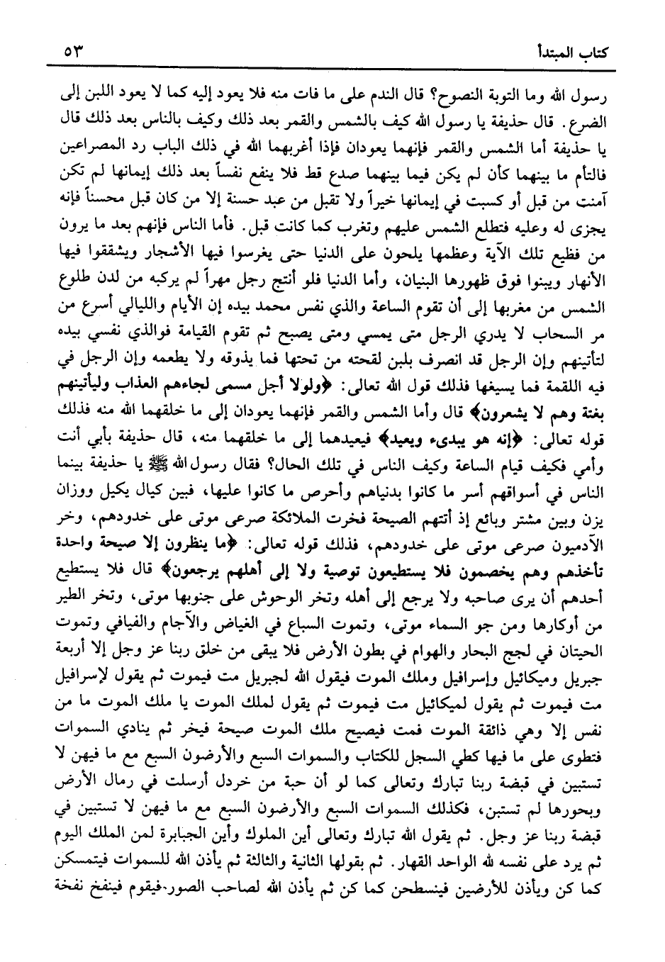فَأَمَّا النَّاس فَإِنَّهُم بعد مَا يَرَوْنَ مِنْ فَظِيعِ تِلْكَ الآيَةِ وَعِظَمِهَا يُلِحُّونَ عَلَى الدُّنْيَا حَتَّى يَغْرِسُوا فِيهَا الأَشْجَارَ وَيُشَقِّقُوا فِيهَا الأَنْهَارَ وَيَبْنُوا فَوْقَ ظُهُورِهَا الْبُنْيَانَ، وَأَمَّا الدُّنْيَا فَلَوْ أَنْتَجَ رَجُلٌ مَهْرًا لَمْ يَرْكَبْهُ مِنْ لَدُنْ طُلُوعِ الشَّمْسِ مِنْ مَغْرِبِهَا إِلَى أَنْ تَقُومَ السَّاعَةُ وَالَّذِي نَفْسُ مُحَمَّدٍ بِيَدِهِ إِنَّ الأَيَّامَ وَاللَّيَالِيَ أَسْرَعُ مِنْ مَرِّ السَّحَابِ لَا يَدْرِي الرَّجُلُ مَتَى يَمْسِي وَمَتَى يُصْبِحُ ثُمَّ تَقُومُ الْقِيَامَةُ فَوَالَّذِي نَفْسِي بِيَدِهِ لَتَأْتِيَنَّهُمْ وَإِنَّ الرَّجُلَ قَدِ انْصَرَفَ بِلَبَنِ لِقْحَتِهِ مِنْ تَحْتِهَا فَمَا يَذُوقُهُ وَلا يَطْعَمُهُ وَإِنَّ الرَّجُلَ فِي فِيهِ اللُّقْمَةُ فَمَا يُسِيغُهَا فَذَلِكَ قَوْلُ اللَّهِ تَعَالَى: {وَلَوْلا أَجَلٌ مُسَمًّى لَجَاءَهُمُ الْعَذَابُ وَلَيَأْتِيَنَّهُمْ بَغْتَةً وَهُمْ لَا يَشْعُرُونَ} قَالَ وَأَمَّا الشَّمْسُ وَالْقَمَرُ فَإِنَّهُمَا يَعُودَانِ إِلَى مَا خَلَقَهُمَا اللَّهُ مِنْهُ فَذَلِكَ قَوْلُهُ تَعَالَى: {إِنَّهُ هُوَ يبدئ وَيُعِيد} فَيُعِيدُهُمَا إِلَى مَا خَلَقَهُمَا مِنْهُ، قَالَ حُذَيْفَةُ بِأَبِي أَنْتَ وَأُمِّي فَكَيْفَ قِيَامُ السَّاعَةِ وَكَيْفَ النَّاسُ فِي تِلْكَ الْحَالِ؟ فَقَالَ رَسُولُ الله يَا حُذَيْفَةُ بَيْنَمَا النَّاسُ فِي أَسْوَاقِهِمْ أَسَرُّ مَا كَانُوا بِدُنْيَاهُمْ وَأَحْرَصُ مَا كَانُوا عَلَيْهَا، فَبَيْنَ كَيَّالٍ يَكِيلُ وَوَزَّانٍ يَزِنُ وَبَيْنَ مُشْتَرٍ وَبَائِعٍ إِذْ أَتَتْهُمُ الصَّيْحَةُ فَخَرَّتِ الْمَلائِكَةُ صَرْعَى مَوْتَى عَلَى خُدُودِهِمْ، وَخَرَّ الآدَمِيُّونَ صَرْعَى مَوْتَى عَلَى خُدُودِهِمْ، فَذَلِكَ قَوْلُهُ تَعَالَى: {مَا يَنْظُرُونَ إِلا صَيْحَةً وَاحِدَةً تَأْخُذُهُمْ وَهُمْ يَخِصِّمُونَ فَلا يَسْتَطِيعُونَ تَوْصِيَةً وَلا إِلَى أَهْلِهِمْ يَرْجِعُونَ} قَالَ فَلا يَسْتَطِيعُ أَحَدُهُمْ أَنْ يَرَى صَاحِبَهُ وَلا يَرْجِعُ إِلَى أَهْلِهِ وَتَخِرُّ الْوُحُوشُ عَلَى جُنُوبِهَا مَوْتَى، وَتَخِرُّ الطَّيْرُ مِنْ أَوْكَارِهَا وَمِنْ جَوِّ السَّمَاءِ مَوْتَى، وَتَمُوتُ السِّبَاعُ فِي الْغِيَاضِ وَالآجَامِ وَالْفَيَافِي وَتَمُوتُ الْحِيتَانُ فِي لُجَجِ الْبِحَارِ وَالْهَوَامُّ فِي بُطُونِ الأَرْضِ فَلا يَبْقَى مِنْ خَلْقِ رَبِّنَا عَزَّ وَجَلَّ إِلا أَرْبَعَةٌ جِبْرِيلُ وَمِيكَائِيلُ وَإِسْرَافِيلُ وَمَلَكُ الْمَوْتِ فَيَقُولُ اللَّهُ لِجِبْرِيلَ مُتْ فَيَمُوتُ ثُمَّ يَقُولُ لإِسْرَافِيلَ مُتْ فَيَمُوتُ ثُمَّ يَقُولُ لِمِيكَائِيلَ مُتْ فَيَمُوتُ ثُمَّ يَقُولُ لِمَلَكِ الْمَوْتِ يَا مَلَكَ الْمَوْتِ مَا مِنْ نَفْسٍ إِلَّا وَهِيَ ذَائِقَةُ الْمَوْتِ فَمُتْ فَيَصِيحُ مَلَكُ الْمَوْتِ صَيْحَةً فَيَخِرُّ ثُمَّ يُنَادِي السَّمَوَات فتطوى عَلَى مَا فِيهَا كَطَيِّ السِّجِلِّ للْكتاب وَالسَّمَوَات السَّبْعَ وَالأَرَضِونَ السَّبْعَ مَعَ مَا فِيهِنَّ لَا تَسْتَبِينُ فِي قَبْضَةِ رَبِّنَا تَبَارَكَ وَتَعَالَى كَمَا لَوْ أَنَّ حَبَّةً مِنْ خَرْدَلٍ أُرْسِلَتْ فِي رِمَالِ الأَرْضِ وَبُحُورِهَا لَمْ تَسْتَبِنْ، فَكَذَلِك السَّمَوَات السَّبع والأرضون السَّبْعَ مَعَ مَا فِيهِنَّ لَا تستبين فِي قَبْضَةِ رَبِّنَا عَزَّ وَجَلَّ.