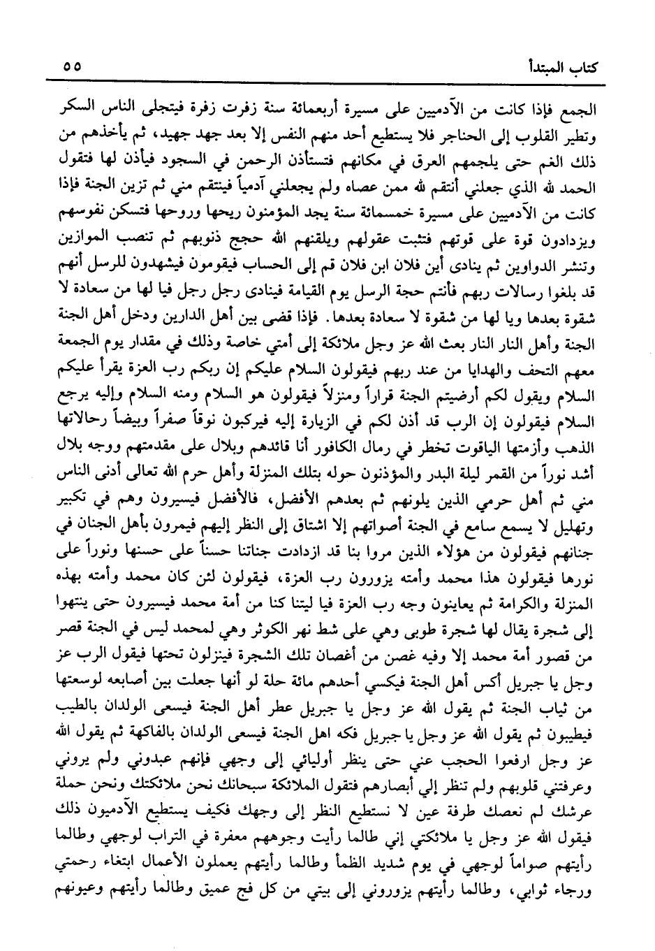 فَإِذا قضى بَين أهل الدَّاريْنِ وَدخل أهلُ الْجنَّة الْجنَّة وأهلُ النَّار النَّار بعثَ الله عَزَّ وَجَلَّ مَلَائِكَة إِلَى أمتِي خَاصَّة وَذَلِكَ فِي مِقْدَار يَوْم الْجُمُعَة مَعَهم التحف والهدايا من عِنْدَ ربِّهم فَيَقُولُونَ السلامُ عَلَيْكُم إِن ربكُم رب الْعِزَّة يقْرَأ عَلَيْكُم السَّلَام وَيَقُول لكم أرضيتم الْجنَّة قرارًا ومنزلاً فَيَقُولُونَ هُوَ السَّلَام وَمِنْه السَّلَام وَإِلَيْهِ يرجعُ السَّلَام فَيَقُولُونَ إِن الرب قد أذنَ لكم فِي الزِّيَارَة إِلَيْهِ فيركبون نوقًا صفرًا وبيضًا رحالاتها الذَّهَب وَأَزِمَّتهَا الْيَاقُوت تَخْطُرُ فِي رمال الكافور أَنَا قائدهم وبلال عَلَى مقدمتهم وَوجه بِلَال أَشد نورا من الْقَمَر لَيْلَة البدرِ والمؤذنونَ حوله بِتِلْكَ الْمنزلَة وأهلُ حرم الله تَعَالَى أدنَى النَّاس مني ثُمَّ أهلُ حرمي الَّذين يَلُونَهُمْ ثُمَّ بعدهمْ الْأَفْضَل، فَالْأَفْضَل فيسيرون وهم فِي تَكْبِير وتهليل لَا يسمع سامع فِي الْجنَّة أَصْوَاتهم إِلَّا اشتاقَ إِلَى النظرِ إِلَيْهِم فيمرونَ بِأَهْل الْجنان فِي جنانِهم فَيَقُولُونَ من هَؤُلَاءِ الَّذين مروا بِنَا قد ازدادت جناتنا حسنا عَلَى حسنها ونورا على نورها فَيَقُولُونَ هَذَا مُحَمَّد وَأمته يزورون ربَّ العزَّة، فَيَقُولُونَ لَئِن كَانَ مُحَمَّد وَأمته بِهذه الْمنزلَة والكرامة ثُمَّ يعاينون وَجه رب الْعِزَّة فيا ليتنا كُنَّا من أمة مُحَمَّد فيسيرون حَتَّى ينْتَهوا إِلَى شَجَرَة يُقال لَهَا شَجَرَة طُوبَى وَهِي عَلَى شط نَهْر الْكَوْثَر وَهِي لِمحمدٍ لَيْسَ فِي الْجنَّة قصرٌ من قُصُور أمة مُحَمَّد إِلَّا وَفِيه غصنٌ من أغصانِ تِلْكَ الشَّجَرَة فينزلونَ تحتهَا فَيَقُول الرب عَزَّ وَجَلَّ يَا جِبْرِيل أكس أهل الْجنَّة فيكسي أحدهم مائَة حلَّة لَو أنّها جعلت بَين أَصَابِعه لوسعتها من ثِيَاب الْجنَّة ثُمَّ يَقُولُ الله عَزَّ وَجَلَّ يَا جِبْرِيل عطر أهل الْجنَّة فيسعى الْولدَان بالطيب فيطيبون ثُمَّ يَقُولُ الله عَزَّ وَجَلَّ يَا جِبْرِيل فكه أهل الْجنَّة فيسعى الْولدَان بالفاكهةِ ثُمَّ يَقُولُ الله عَزَّ وَجَلَّ ارْفَعُوا الْحجب عني حَتَّى ينظر أوليائي إِلَى وَجْهي فَإِنَّهُم عبدوني ولَمْ يروني وعرفتني قُلُوبهم ولَمْ تنظر إليّ أَبْصَارهم فَتَقول الْمَلَائِكَة سُبْحَانَكَ نَحنُ ملائكتك ونحنُ حَملَة عرشك لم نعصك طرفَة عين لَا نستطيع النّظر إِلَى وَجهك فَكيف يَسْتَطِيع الآدميون ذَلِكَ فَيَقُول الله عَزَّ وَجَلَّ يَا ملائكتي إِنِّي طالما رأيتُ وُجُوههم معفرة فِي التُّرَاب لوجهي وطالما رَأَيْتهمْ صوامًا لوجهي فِي يَوْم شَدِيد الظمأ وطالما رَأَيْتهمْ يعْملُونَ الْأَعْمَال ابْتِغَاء رَحْمَتي ورجاء ثوابي، وطالما رَأَيْتهمْ يزوروني إِلَى بَيْتِي من كل فج عميق وطالما رَأَيْتهمْ وعيونَهم