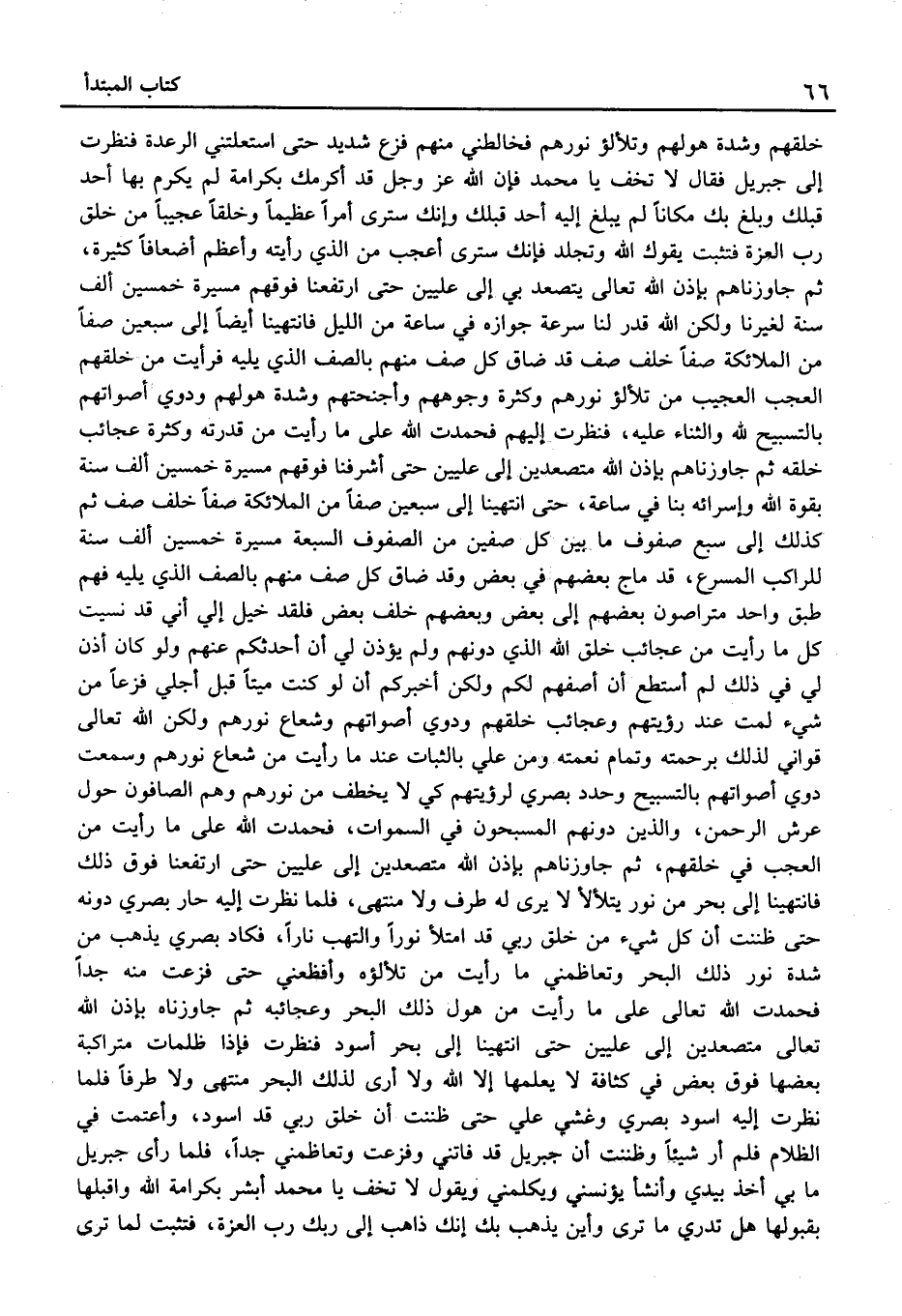 خلقهمْ وَشدَّة هولِهم وتلألؤ نورهم فخالطني مِنْهُم فزع شَدِيد حَتَّى استعلتني الرعدة فنظرتُ إِلَى جِبْرِيل فَقَالَ لَا تَخف يَا مُحَمَّد فَإِن الله عز وَجل قد أكرمكَ بكرامة لَمْ يُكرم بِهَا أحد قبلك وَبلغ بك مَكَانا لَم يبلغ إِلَيْهِ أحد قبلك وَإنَّك سترى أمرا عَظِيما وخلقًا عجيبًا من خلق رب الْعِزَّة فَتثبت يقوك الله وتجلد فَإنَّك سترى أعجب من الَّذِي رَأَيْته وَأعظم أضعافًا كَثِيرَة، ثُمَّ جاوزناهم بِإِذن الله تَعَالَى يتَصَعَّد بِي إِلَى عليين حَتَّى ارتفعنا فَوْقهم مسيرَة خمسين ألف سنة لغيرنا وَلَكِن الله قدر لنا سرعَة جَوَازه فِي سَاعَة من اللَّيْل فَانْتَهَيْنَا أَيْضا إِلَى سبعين صفا من الْمَلَائِكَة صفا خلف صف قد ضاقَ كل صف مِنْهُم بالصف الَّذِي يَلِيهِ فَرَأَيْت من خلقهمْ الْعجب العجيب من تلألؤ نورهم وَكَثْرَة وُجُوههم وأجنحتهم وَشدَّة هولِهم ودوي أصواتِهم بالتسبيح لله وَالثنَاء عَلَيْهِ، فنظرتُ إِلَيْهِم فحمدتُ الله عَلَى مَا رَأَيْت من قدرته وَكَثْرَة عجائب خلقه ثُمَّ جاوزناهم بِإِذن الله متصعدين إِلَى عليين حَتَّى أَشْرَفنَا فَوْقهم فَوْقهم مسيرَة خمسين ألف سنة بِقُوَّة الله وإسرائه بِنَا فِي سَاعَة، حَتَّى انتهينا إِلَى سبعين صفا من الْمَلَائِكَة صفا خلف صف ثُمَّ كَذَلِك إِلَى سبع صُفُوف مَا بَين كل صفّين من الصُّفُوف السَّبْعَة مسيرَة خمسين ألف سنة للراكب المسرع، قد ماج بَعضهم فِي بعض وَقد ضاقَ كل صف مِنْهُم بالصف الَّذِي يَلِيهِ فهم طبق وَاحِد متراصونَ بَعضهم إِلَى بعض وَبَعْضهمْ خلف بعض فَلَقَد خيل إليّ أَنِّي قد نسيت كل مَا رَأَيْت من عجائب خلق الله الَّذِي دونهم ولَم يُؤذن لي أَن أحدثكُم عَنْهُم وَلَو كَانَ أذن لي فِي ذَلِكَ لم أستطع أَن أصفهم لكم وَلَكِن أخْبركُم أَن لَو كنت مَيتا قبل أَجلي فَزعًا من شَيْء لَمُت عِنْدَ رُؤْيَتهمْ وعجائب خلقهمْ ودوي أصواتِهم وشعاع نورهم وَلَكِن الله تَعَالَى قواني لذَلِك برحمته وَتَمام نعْمَته وَمن عَليّ بالثبات عِنْد مَا رَأَيْت من شُعَاع نورهم وَسمعت دوِي أصواتِهم بالتسبيح وحدد بَصرِي لرؤيتهم كي لَا يخطف من نورهم وهم الصافون حول عرش الرَّحْمَن، وَالَّذين دونهم المسبحونَ فِي السَّمَاوَات، فحمدتُ الله عَلَى مَا رَأَيْت من الْعجب فِي خلقهمْ، ثُمَّ جاوزناهم بِإِذن الله متصعدين إِلَى عليين حَتَّى ارتفعنا فَوق ذَلِكَ فَانْتَهَيْنَا إِلَى بَحر من نور يتلألأ لَا يرى لَهُ طرف وَلَا مُنْتَهى، فَلَمَّا نظرت إِلَيْهِ حَار بَصرِي دونه حَتَّى ظننتُ أَن كل شَيْء من خلق رَبِّي قد امْتَلَأَ نورا والتهبَ نَارا، فكاد بَصرِي يذهبُ من شدَّة نور ذَلِكَ الْبَحْر وتعاظمني مَا رَأَيْت من تلألؤه وأفظعني حَتَّى فزعت مِنْهُ جدا فحمدتُ الله تَعَالَى عَلَى مَا رَأَيْت من هول ذَلِكَ الْبَحْر وعجائبه ثُمَّ جاوزناهُ بِإِذن الله تَعَالَى متصعدين إِلَى عليين حَتَّى انتهينا إِلَى بَحر أسود فنظرتُ فَإِذا ظلماتٌ متراكبة بَعْضهَا فَوق بعض فِي كَثَافَة لَا يعلمهَا إِلَّا الله وَلَا أرى لذَلِك الْبَحْر مُنْتَهى وَلَا طرفا فَلَمَّا نظرت إِلَيْهِ اسْوَدَّ بَصرِي وَغشيَ عَليّ حَتَّى ظننتُ أَن خلق رَبِّي قد اسود، وأعتمت فِي الظلام فَلم أر شَيْئا وظننتُ أَن جِبْرِيل قد فَاتَنِي وفزعت وتعاظمني جدًّا، فَلَمَّا رأى جِبْرِيل مَا بِي أَخذ بيَدي وَأَنْشَأَ يؤنسني ويُكلمني وَيَقُول لَا تَخف يَا مُحَمَّد أبشر بكرامة الله واقبلها بقبولها هَلْ تَدْرِي مَا ترى وَأَيْنَ يذهبُ بك إِنَّك ذاهبٌ إِلَى رَبك رب الْعِزَّة، فَتثبت لما ترى