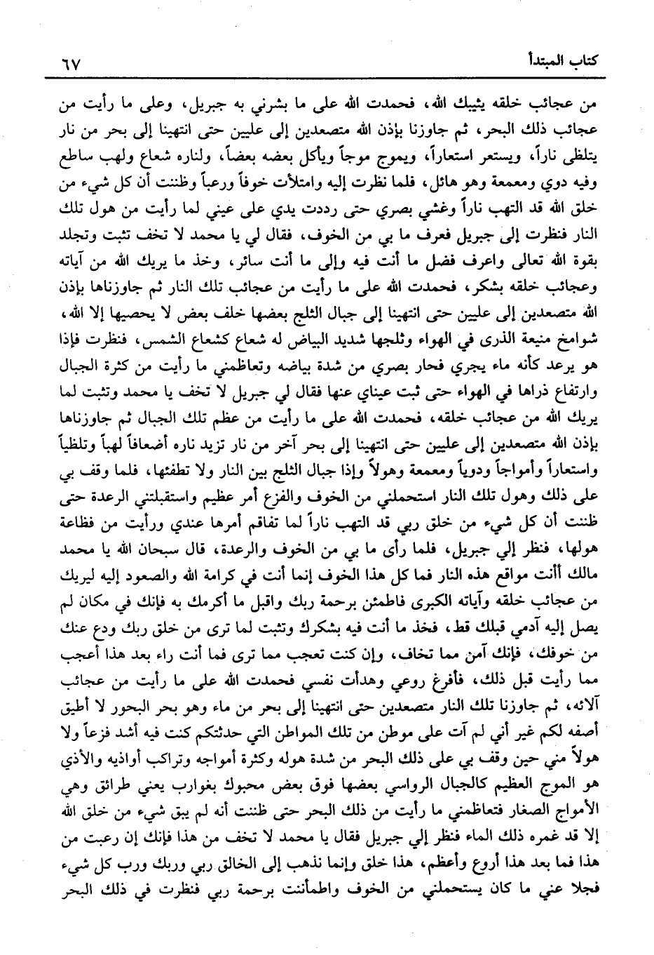 من عجائب خلقه يثيبك الله، فحمدتُ الله عَلَى مَا بشرني بِهِ جِبْرِيل، وعَلى مَا رأيتُ من عجائب ذَلِكَ الْبَحْر، ثُمَّ جاوزنا بِإِذن الله متصعدين إِلَى عليين حَتَّى انتهينا إِلَى بَحر من نَار يتلظى نَارا، ويستعر استعارًا، ويَمُوجُ موجًا ويأكلُ بعضه بَعْضًا، ولناره شُعَاع ولَهب سَاطِع وَفِيه دوِي ومعمعة وَهُوَ هائل، فَلَمَّا نظرتُ إِلَيْهِ وامتلأت خوفًا ورعبًا وظننتُ أَن كل شَيْء من خلق الله قد التهبَ نَارا وَغشيَ بَصرِي حَتَّى رددت يَدي عَلَى عَيْني لما رَأَيْت من هول تِلْكَ النَّار فنظرتُ إِلَى جِبْرِيل فَعرف مَا بِي من الْخَوْف، فَقَالَ لي يَا مُحَمَّد لَا تخف تثبت وتَجلد بِقُوَّة الله تَعَالَى واعرف فضل مَا أَنْت فِيهِ وَإِلَى مَا أَنْت سَائِر، وَخذ مَا يُرِيك الله من آيَاته وعجائب خلقه بشكر، فحمدت الله عَلَى مَا رَأَيْت من عجائب تِلْكَ النَّار ثُمَّ جاوزناها بِإِذن الله متصعدين إِلَى عليين حَتَّى انتهينا إِلَى جبال الثَّلج بَعْضهَا خلف بعض لَا يحصيها إِلَّا الله، شوامخ منيعة الذرى فِي الْهَوَاء وثلجها شَدِيد الْبيَاض لَهُ شُعَاع كشعاع الشَّمْس، فنظرتُ فَإِذا هُوَ يرعد كَأَنَّهُ مَاء يجْرِي فحار بَصرِي من شدَّة بياضه وتعاظمني مَا رَأَيْت من كَثْرَة الْجبَال وارتفاع ذراها فِي الْهَوَاء حَتَّى ثَبت عَيْنَايَ عَنْهَا فَقَالَ لي جِبْرِيل لَا تَخف يَا مُحَمَّد وَتثبت لِما يُرِيك الله من عجائب خلقه، فحمدتُ الله عَلَى مَا رأيتُ من عظم تِلْكَ الْجبَال ثُمَّ جاوزناها بِإِذن الله متصعدين إِلَى عليين حَتَّى انتهينا إِلَى بَحر آخر من نَار تزيد ناره أضعافًا لَهبًا وتلظيًا واستعارًا وأمواجا ودويا ومعمعة وَهولا وَإِذا جبال الثَّلج بَين النَّار وَلَا تطفئها، فَلَمَّا وقف بِي عَلَى ذَلِكَ وهول تِلْكَ النَّار استحملني من الْخَوْف والفزع أَمر عَظِيم واستقبلتني الرعدة حَتَّى ظننتُ أَن كل شَيْء من خلق رَبِّي قد التهب نَارا لما تفاقم أمرهَا عِنْدِي ورأيتُ من فظاعة هولها، فَنظر إليَّ جِبْرِيل، فَلَمَّا رأى مَا بِي من الْخَوْف والرعدة، قَالَ سُبْحَانَ الله يَا مُحَمَّد مَالك أَأَنْت مواقع هَذِه النَّار فَمَا كل هَذَا الْخَوْف إنّما أَنْت فِي كَرَامَة الله والصعود إِلَيْهِ ليريك من عجائب خلقه وآياته الْكُبْرَى فاطمئن برحمة رَبك وَأَقْبل مَا أكرمك بِهِ فَإنَّك فِي مَكَان لَمْ يصل إِلَيْهِ آدَمِيّ قبلك قطّ، فَخذ مَا أنتَ فِيهِ بشكرك وَتثبت لِما ترى من خلق رَبك ودع عَنْك من خوفك، فَإنَّك آمن مِمَّا تخَاف، وَإِن كنت تعجب مِمَّا تَرَى فَمَا أَنْت رَاء بعد هَذَا أعجبُ مِمَّا رَأَيْت قبل ذَلِكَ، فأفرغ روعي وهدأتُ نَفسِي فحمدتُ الله عَلَى مَا رَأَيْت من عجائب آلائه، ثُمَّ جاوزنا تِلْكَ النَّار متصعدين حَتَّى انتهينا إِلَى بَحر من مَاء وَهُوَ بَحر البحور لَا أُطِيق أصفه لكم غير أَنِّي لم آتٍ عَلَى موطن من تِلْكَ المواطن الَّتِي حدثتكم كنت فِيهِ أَشد فَزعًا وَلَا هولاً مني حِين وقف بِي عَلَى ذَلِكَ الْبَحْر من شدَّة هوله وَكَثْرَة أمواجه وتراكب أواذيه والأذي هُوَ الموج الْعَظِيم كالجبال الرواسِي بَعْضهَا فَوق بعض محبوك بغوارب يَعْنِي طرائق وَهِي الأمواج الصغار فتعاظمني مَا رَأَيْت من ذَلِكَ الْبَحْر حَتَّى ظَنَنْت أَنَّهُ لَمْ يبْق شَيْء من خلق الله إِلَّا قد غمره ذَلِكَ المَاء فَنظر إليّ جِبْرِيل فَقَالَ يَا مُحَمَّد لَا تَخف من هَذَا فَإنَّك إِن رعبت من هَذَا فَمَا بعد هَذَا أروع وَأعظم، هَذَا خلق وإنّما نَذْهَب إِلَى الْخَالِق رَبِّي وَرَبك وَرب كل شَيْء فجلا عني مَا كَانَ يستحملني من الْخَوْف واطمأننتُ برحمة رَبِّي فنظرتُ فِي ذَلِك الْبَحْر
