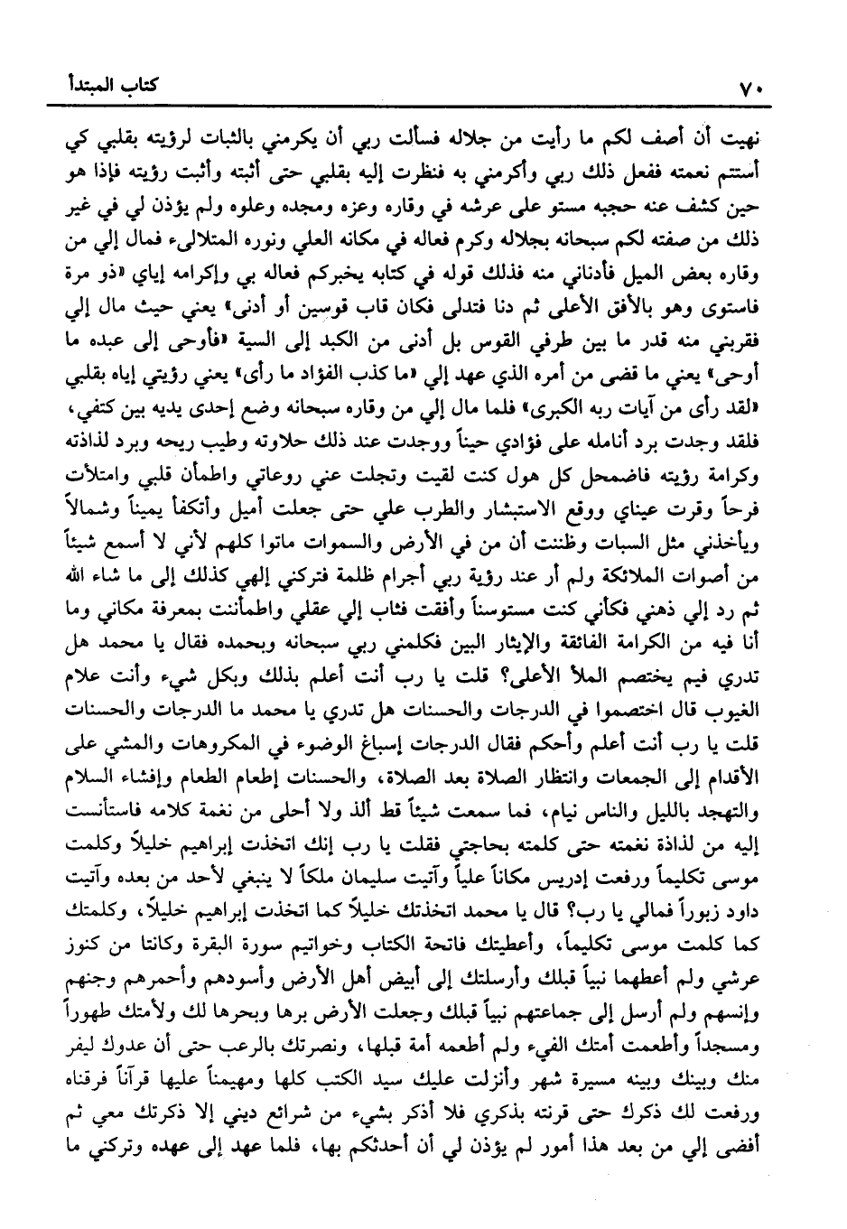 نُهيت أَن أصف لكم مَا رَأَيْت من جَلَاله فسألتُ رَبِّي أَن يكرمني بالثبات لرُؤْيَته بقلبي كي أستتم نعْمَته فَفعل ذَلِكَ رَبِّي وأكرمني بِهِ فنظرتُ إِلَيْهِ بقلبي حَتَّى أثْبته وَأثبت رُؤْيَته فَإِذا هُوَ حِين كشف عَنْه حجبه مستو عَلَى عَرْشه فِي وقاره وعزه ومجده وعلوه ولَم يُؤذن لي فِي غير ذَلِكَ من صفته لكم سُبْحَانَهُ بِجلاله وكرم فعاله فِي مَكَانَهُ الْعلي ونوره المتلألئ فَمَال إِلَيّ من وقاره بعض الْميل فأدناني مِنْهُ فَذَلِك قَوْله فِي كِتَابه يُخبركم فعاله بِي وإكرامه إيَّايَ {ذُو مِرَّةٍ فَاسْتَوَى وَهُوَ بِالأُفُقِ الأَعْلَى ثُمَّ دَنَا فَتَدَلَّى فَكَانَ قَابَ قوسين أَو أدني} يَعْنِي حَيْثُ مَال إِلَى فقربني مِنْهُ قدر مَا بَين طرفِي الْقوس بل أدنى من الكبد إِلَى السية {فَأَوْحَى إِلَى عَبْدِهِ مَا أوحى} يَعْنِي مَا قضى من أمره الَّذِي عهد إليّ {مَا كَذَبَ الْفُؤَاد مَا رأى} يَعْنِي رؤيتي إيّاهُ بقلبي {لَقَدْ رَأَى مِنْ آيَاتِ رَبِّهِ الْكُبْرَى} فَلمَّا مَال إِلَيّ من وقاره سُبْحَانَهُ وضع إِحْدَى يَدَيْهِ بَين كَتِفي، فَلَقَد وجدتُ برد أنامله عَلَى فُؤَادِي حينا ووجدتُ عِنْدَ ذَلِكَ حلاوته وَطيب رِيحه وَبرد لذاذته وكرامة رُؤْيَته فاضمحلَ كل هولٍ كنت لقِيت وتجلت عني روعاتي وَاطْمَأَنَّ قلبِي وامتلأت فَرحا وقرت عَيْنَايَ وَوَقع الاستبشار والطرب عَلي حَتَّى جعلتُ أميل وأتكفأ يَمِينا وَشمَالًا ويأخذني مثل السبات وظننتُ أَن من فِي الأَرْض وَالسَّمَوَات مَاتُوا كلهم لِأَنِّي لَا أسمعُ شَيْئا من أصوات الْمَلَائِكَة ولَم أر عِنْدَ رُؤْيَة رَبِّي أجرام ظلمَة فتركني إلهي كَذَلِك إِلَى مَا شَاءَ الله ثُمَّ رد إِلَيّ ذهني فَكَأَنِّي كنت مستوسنًا وأفقتُ فَثَابَ إِلَيّ عَقْلِي واطمأننتُ بِمعرفة مَكَاني وَمَا أَنَا فِيهِ من الْكَرَامَة الفائقة والإيثار الْبَين فكلمني رَبِّي سُبْحَانَهُ وبِحمده فَقَالَ يَا مُحَمَّد هَلْ تَدْرِي فيمَ يَخْتصم الْمَلأ الْأَعْلَى؟ قلتُ يَا رب أَنْت أعلمُ بذلك وَبِكُل شَيْء وَأَنت علام الغيوب قَالَ اخْتَصَمُوا فِي الدَّرَجَات والحسنات هَلْ تَدْرِي يَا مُحَمَّد مَا الدَّرَجَات والحسنات قلت يَا رب أَنْت أعلمُ وَأحكم فَقَالَ الدَّرَجَات إسباغ الْوضُوء فِي المكروهات وَالْمَشْي عَلَى الْأَقْدَام إِلَى الْجُمُعَات وانتظار الصَّلَاة بعد الصَّلَاة، والحسنات إطْعَام الطَّعَام وإفشاء السَّلَام والتهجد بِاللَّيْلِ وَالنَّاس نيام، فَمَا سَمِعْتُ شَيْئا قطّ ألذ وَلَا أحلى من نَغمَة كَلَامه فاستأنستُ إِلَيْهِ من لذاذة نغمته حَتَّى كَلمته بحاجتي فَقلت يَا رب إِنَّك اتَّخذت إِبْرَاهِيم خَلِيلًا وَكلمت مُوسَى تكليمًا وَرفعت إِدْرِيس مَكَانا عليًّا وآتيت سُلَيْمَان ملكا لَا يَنْبَغِي لأحد من بعده وآتيتَ دَاوُد زبورا فَمَالِي يَا رب؟ قَالَ يَا مُحَمَّد اتخذتك خَلِيلًا كَمَا اتَّخذت إِبْرَاهِيم خَلِيلًا، وكلمتك كَمَا كلمت مُوسَى تكليمًا، وأعطيتك فَاتِحَة الْكتاب وخواتيم سُورَة الْبَقَرَة وكانتا من كنوز عَرْشِي وَلم أعطهما نبيًّا قبلك وأرسلتك إِلَى أَبيض أهل الأَرْض وأسودهم وأحمرهم وجنهم وإنسهم ولَم أرسل إِلَى جَمَاعَتهمْ نبيًّا قبلك وجعلتُ الأَرْض برهَا وبحرها لَك وَلِأُمَّتِك طهُورا ومسجدًا وأطعمتُ أمتك الْفَيْء ولَم أطْعمهُ أمة قبلهَا، ونصرتُك بِالرُّعْبِ حَتَّى أَن عَدوك ليفر مِنْك وَبَيْنك وَبَينه مسيرَة شهر وأنزلت عَلَيْك سيد الْكتب كلهَا ومهيمنًا عَلَيْهَا قُرْآنًا فرقناهُ وَرفعت لَك ذكرك حَتَّى قرنته بذكري فَلَا أذكر بِشَيْء من شرائع ديني إِلَّا ذكرتك معي ثُمَّ أفْضى إِلَى من بعد هَذَا أُمُور لَم يُؤذن لي أَن أحدثكُم بِهَا، فلمّا عهد إليّ عَهده وَتَرَكَنِي مَا