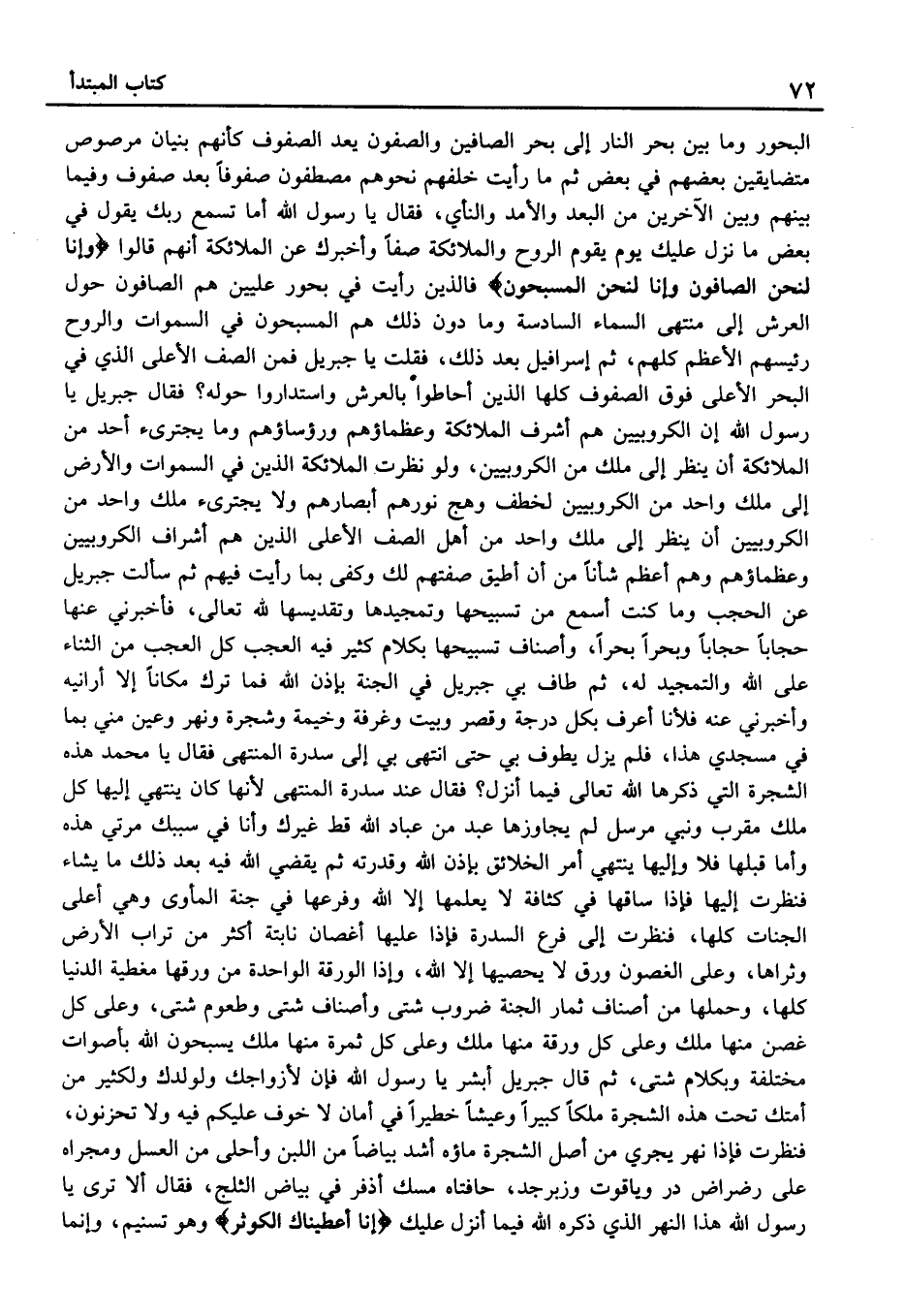 البحور وَمَا بَين بَحر النَّار إِلَى بَحر الصافين والصفون يعد الصُّفُوف كأنّهم بنيانٌ مرصوص متضايقين بَعضهم فِي بعض ثُمَّ مَا رأيتُ خَلفهم نحوهم مصطفون صُفُوفا بعد صُفُوف وَفِيمَا بَينهم وَبَين الآخرين من الْبعد والأمد والنأي، فَقَالَ يَا رَسُول الله أما تسمعُ رَبك يَقُولُ فِي بعض مَا نزل عَلَيْك {يَوْمَ يَقُومُ الرّوح وَالْمَلَائِكَة صفا} وأخبرك عَن الْمَلَائِكَة أَنهم قَالُوا {وَإِنَّا لَنَحْنُ الصَّافُّونَ وَإِنَّا لَنَحْنُ المسبحون} فَالَّذِينَ رَأَيْت فِي بِحور عليين هُمُ الصافون حول الْعَرْش إِلَى مُنْتَهى السَّمَاء السَّادِسَة وَمَا دون ذَلِك هم المسبحون فِي السَّمَوَات وَالروح رئيسهم الْأَعْظَم كلهم، ثُمَّ إسْرَافيل بعد ذَلِكَ، فقلتُ يَا جِبْرِيل فَمن الصَّفّ الْأَعْلَى الَّذِي فِي الْبَحْر الْأَعْلَى فَوق الصُّفُوف كلهَا الَّذين أحاطوا بالعرش واستداروا حوله؟ فَقَالَ جِبْرِيل يَا رَسُول الله إِن الكروبيين هُمْ أشرف الْمَلَائِكَة وعظماؤهم ورؤساؤهم وَمَا يَجْتَرئ أحد من الْمَلَائِكَة أَن ينظرَ إِلَى ملك من الكروبيين، وَلَو نظرت الْمَلَائِكَة الَّذين فِي السَّمَوَات وَالْأَرْض إِلَى ملك وَاحِد من الكروبيين لخطف وهج نورهم أَبْصَارهم وَلَا يَجْتَرئ ملك وَاحِد من الكروبيين أَن ينظر إِلَى ملك وَاحِد من أهل الصَّفّ الْأَعْلَى الَّذين هُمْ أَشْرَاف الكروبيين وعظماؤهم وهم أعظمُ شَأْنًا من أَن أُطِيق صفتهمْ لَك وَكفى بِما رأيتَ فيهم ثُمَّ سَأَلْتُ جبريلَ عَن الْحجب وَمَا كنت أسمع من تسبيحها وتَمْجيدها وتقديسها لله تَعَالَى، فَأَخْبرنِي عَنْهَا حِجَابا حِجَابا وبَحْرًا بَحْرًا، وأصناف تسبيحها بِكلام كثير فِيهِ الْعجب كل الْعجب من الثَّنَاء عَلَى الله والتمجيد لَهُ، ثُمَّ طافَ بِي جِبْرِيل فِي الْجنَّة بِإِذن الله فَمَا ترك مَكَانا إِلَّا أرانيه وَأَخْبرنِي عَنْهُ فلأنا أعرفُ بِكُل دَرَجَة وَقصر وَبَيت وغرفة وخيمة وشجرة ونهر وَعين مني بِما فِي مَسْجِدي هَذَا، فلَمْ يزل يطوفُ بِي حَتَّى انْتهى بِي إِلَى سِدْرَة الْمُنْتَهى فَقَالَ يَا مُحَمَّد هَذِه الشَّجَرَة الَّتِي ذكرهَا الله تَعَالَى فِيمَا أنزل؟ فَقَالَ {عِنْد سِدْرَة الْمُنْتَهى} لأنّها كَانَ يَنْتَهِي إِلَيْهَا كل ملك مقرب وَنَبِي مُرْسل لَمْ يجاوزها عَبْد من عباد الله قطّ غَيْرك وَأَنا فِي سببك مرتي هَذِه وأمّا قبلهَا فَلَا وإليها يَنْتَهِي أَمر الْخَلَائق بِإِذن الله وَقدرته ثُمَّ يقْضِي الله فِيهِ بعد ذَلِكَ مَا يَشَاء فنظرتُ إِلَيْهَا فَإِذا سَاقهَا فِي كَثَافَة لَا يعلمهَا إِلَّا الله وفرعها فِي جنَّة المأوى وَهِي أَعلَى الجنات كلهَا، فنظرتُ إِلَى فرع السِّدْرَة فَإِذا عَلَيْهَا أَغْصَان نابتة أَكثر من تُرَاب الأَرْض وثراها، وعَلى الغصون ورق لَا يُحصيها إِلَّا الله، وَإِذا الورقة الْوَاحِدَة من وَرقهَا مغطية الدُّنْيَا كلهَا، وَحملهَا من أَصْنَاف ثمار الْجنَّة ضروب شَتَّى وأصناف شَتَّى وطعوم شَتَّى، وعَلى كل غُصْن مِنْهَا ملك وعَلى كل ورقة مِنْهَا ملك وعَلى كل ثَمَرَة مِنْهَا ملك يسبحونَ الله بأصواتٍ مُخْتَلفَة وبِكلامٍ شَتَّى، ثُمَّ قَالَ جِبْرِيل أبشر يَا رَسُول الله فَإِن لِأَزْوَاجِك ولولدك ولكثير من أمتك تَحت هَذِه الشَّجَرَة ملكا كَبِيرا وعيشًا خطيرًا فِي أَمَان لَا خوف عَلَيْكُم فِيهِ وَلَا تَحْزنون، فنظرتُ فَإِذا نهر يجْرِي من أصل الشَّجَرَة مَاؤُهُ أَشد بَيَاضًا من اللَّبن وَأحلى من الْعَسَل ومجراهُ عَلَى رَضْرَاض در وَيَاقُوت وَزَبَرْجَد، حافتاهُ مسك أذفر فِي بَيَاض الثَّلج، فَقَالَ أَلا ترى يَا رَسُول الله هَذَا النَّهر الَّذِي ذكره الله فِيمَا أنزل عَلَيْك {إِنَّا أَعْطَيْنَاكَ الْكَوْثَرَ} وَهُوَ تسنيم، وَإِنَّمَا