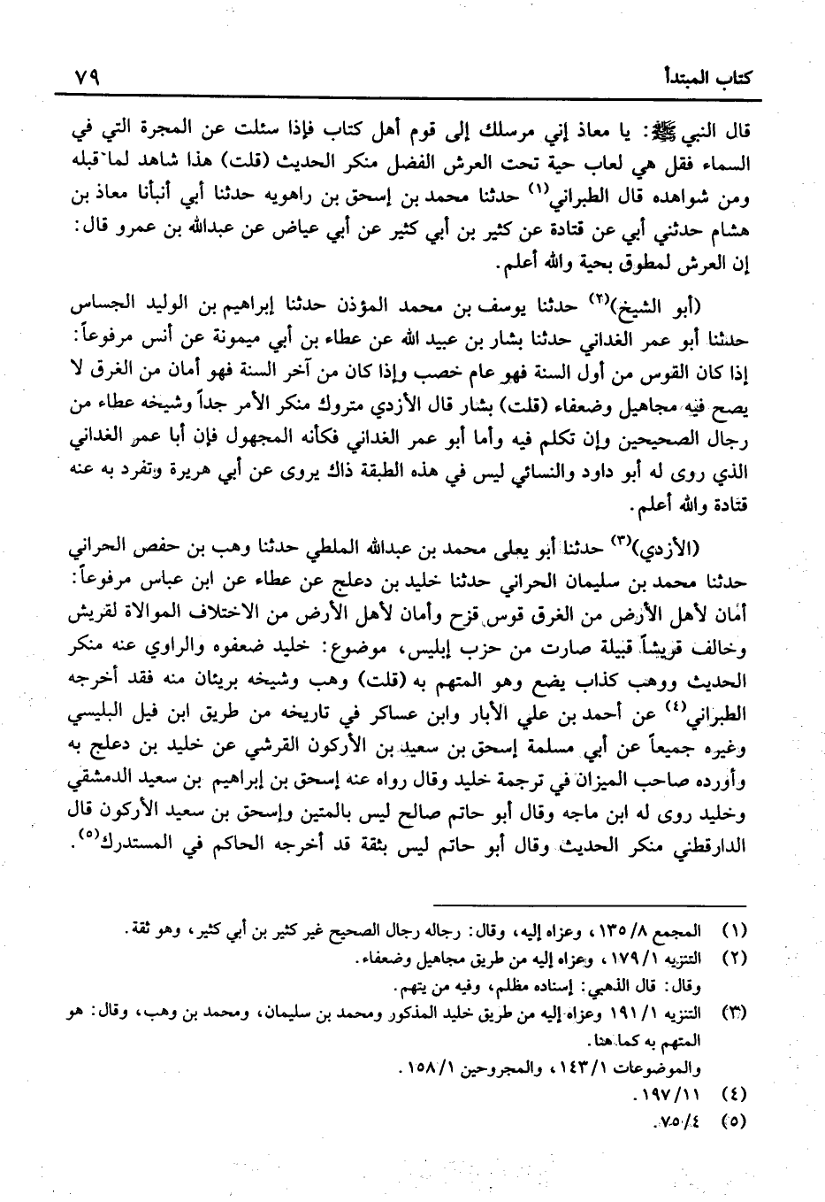 قَالَ النَّبِي: يَا مُعَاذُ إِنِّي مُرْسِلُكَ إِلَى قَوْمٍ أَهْلِ كتاب فَإِذَا سُئِلَتْ عَنِ الْمَجَرَّةِ الَّتِي فِي السَّمَاءِ فَقُلْ هِيَ لُعَابُ حَيَّةٍ تَحْتَ الْعَرْشِ الْفَضْلُ مُنْكَرُ الْحَدِيثِ (قلتُ) هَذَا شاهدٌ لِما قبله وَمن شواهده قَالَ الطَّبَرَانِيّ حَدَّثَنَا مُحَمَّد بْن إِسْحَاق بْن رَاهَوَيْه حَدَّثَنَا أَبِي أَنْبَأنَا معَاذ بْن هِشَام حدَّثَنِي أَبِي عَن قَتَادَة عَن كثير بْن أَبِي كثير عَن أَبِي عِيَاض عَن عَبْدِ اللَّهِ بْنِ عَمْرٍو قَالَ: إِنَّ الْعَرْشَ لَمُطَوَّقٌ بِحَيَّةٍ وَالله أعلم.