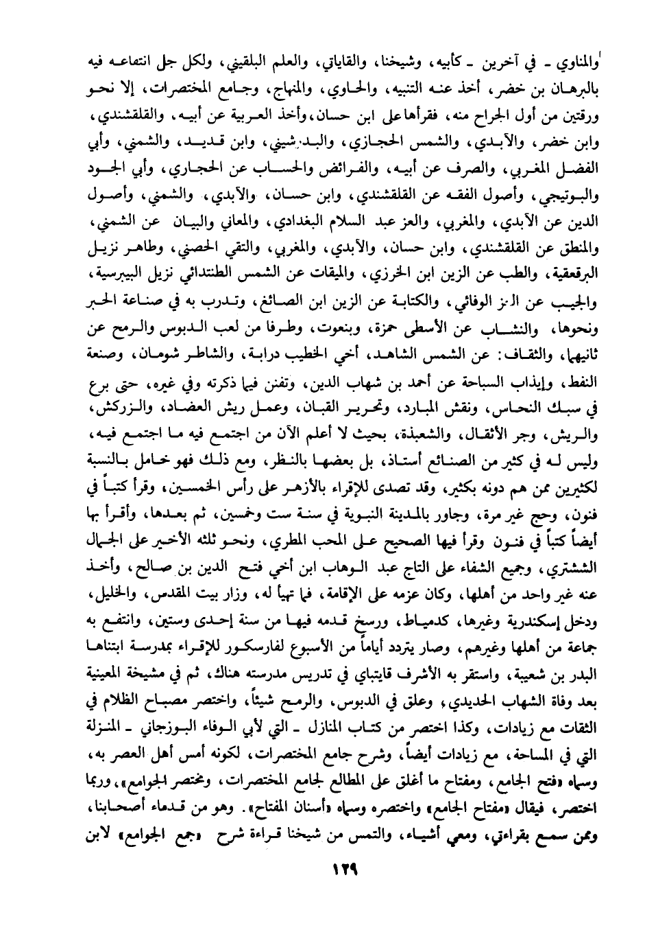 والمناوي - في آخرين كأبيه - وشيخنا والقاياتي والعلم البلقيني ولكل جل انتفاعه فيه بالبرهان بن خضر أخذ عنه التنبيه والحاوي والمنهاج وجامع المختصرات إلا نحو ورقتين من أول الجراح منه فقرأها على ابن حسان وأخذ العربية عن أبيه والقلقشندي وابن خضر والآبدي والشمس الحجازي والبدرشيني وابن قديد والشمني وأبي الفضل المغربي والصرف عن أبيه والفرائض والحساب عن الحجاري وأبي الجود والبوتيجي وأصول الفقه عن القلقشندي وابن حسان والآبدي والشمني وأصول الدين عن الآبدي والمغربي والعز عبد السلام البغدادي والمعاني والبيان عن الشمني والمنطق عن القلقشندي وابن حسان والآبدي والمغربي والتقي الحصني وطاهر نزيل البرقعقية والطب عن الزين ابن الخرزي والميقات عن الشمس الطنتدائي نزيل البيبرسية والجيب عن العز الوفائي والكتابة عن الزين ابن الصائغ وتدرب به في صناعة الحبر ونحوها والنشاب عن الأسطى حمزة وبنعوت وطرفا من لعب الدبوس والرمح عن ثانيهما والثقاف عن الشمس الشاهد أخي الخطيب درابة والشاطر شومان وصنعة النفط وإيذاب السباحة عن أحمد بن شهاب الدين وتفنن فيما ذكرته وفي غيره حتى برع في سبك النحاس ونقش المبارد وتحرير القبان وعمل ريش العضاد والزركش والريش وجر الأثقال والشعبذة بحيث لا أعلم الآن من اجتمع فيه ما اجتمع فيه وليس له في كثير من الصنائع أستاذ بل بعضها بالنظر ومع ذلك فهو خامل بالنسبة لكثيرين ممن هم دونه بكثير وقد تصدى للإقراء بالأزهر على رأس الخمسين وقرأ كتبا في فنون وحج غير مرة وجاور بالمدينة النبوية في سنة ست وخمسين ثم بعدها وأقرأ بها أيضا كتبا في فنون وقرأ فيها الصحيح على المحب المطري ونحو ثلثه الأخير على الجمال الششتري وجميع الشفاء على التاج عبد الوهاب ابن أخي فتح الدين بن صالح وأخذ عنه غير واحد من أهلها وكان عزمه على الإقامة فما تهيأ له وزار بيت المقدس والخليل ودخل إسكندرية وغيرها كدمياط ورسخ قدمه فيها من سنة إحدى وستين وانتفع به جماعة من أهلها وغيرهم وصار يتردد أياما من الأسبوع لفارسكور للإقراء بمدرسة ابتناها البدر بن شعيبة واستقر به الأشرف قايتباي في تدريس مدرسته هناك ثم في مشيخة المعينية بعد وفاة الشهاب الحديدي وعلق في الدبوس والرمح شيئا واختصر مصباح الظلام في الثقات مع زيادات وكذا اختصر من كتاب المنازل - التي لأبي الوفاء البوزجاني - المنزلة التي في المساحة مع زيادات أيضا وشرح جامع المختصرات لكونه أمس أهل العصر به وسماه فتح الجامع ومفتاح ما أغلق على المطالع لجامع المختصرات ومختصر الجوامع وربما اختصر فيقال مفتاح الجامع واختصره وسماه أسنان المفتاح وهو من قدماء أصحابنا وممن سمع بقراءتي ومعي أشياء والتمس من شيخنا قراءة شرح جمع الجوامع