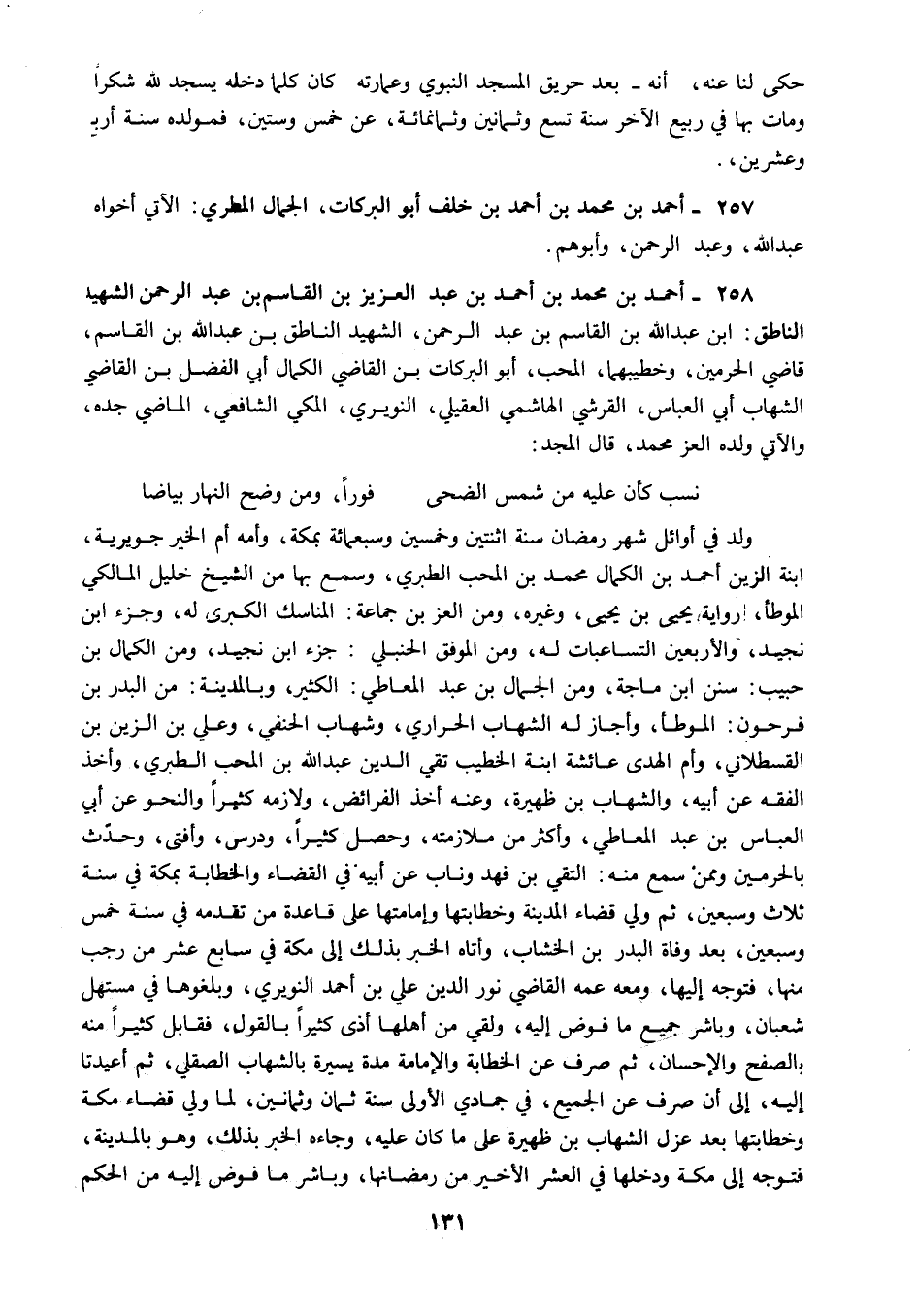 258 - أحمد بن محمد بن أحمد بن عبد العزيز بن القاسم بن عبد الرحمن الشهيد الناطق ابن عبد الله بن القاسم بن عبد الرحمن الشهيد الناطق بن عبد الله بن القاسم قاضي الحرمين وخطيبهما المحب أبو البركات بن القاضي الكمال أبي الفضل بن القاضي الشهاب أبي العباس القرشي الهاشمي العقيلي النويري المكي الشافعي الماضي جده والآتي ولده العز محمد قال المجد نسب: