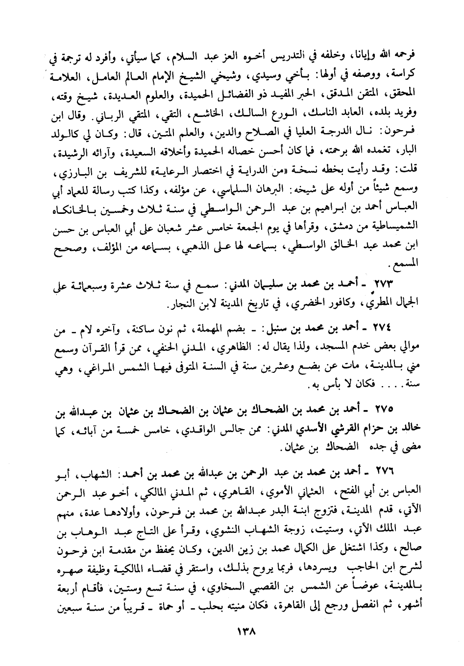 273 - أحمد بن محمد بن سليمان المدني سمع في سنة ثلاث عشرة وسبعمائة على الجمال المطري وكافور الخضري في تاريخ المدينة لابن النجار.