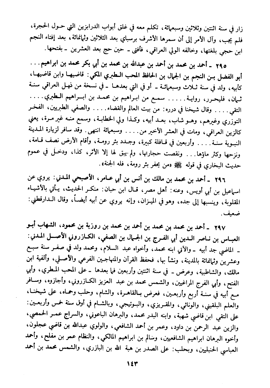 295 - أحمد بن محمد بن أحمد بن عبد الله بن محمد بن أبي بكر محمد بن إبراهيم ... أبو الفضل بن النجم بن الجمال بن الحافظ المحب الطبري المكي قاضيها وابن قاضيها كأبيه ولد في سنة ثلاث وسبعمائة - أو في التي بعدها - في نسخة من ذيل العراقي سنة ثمان فليحرر رواية.... سمع من إبراهيم بن محمد بن إبراهيم الطبري ... التقي ... وقال شيخنا في درره من بيت العالم والقضاء.... والصفي الطبريين الفخر التوزري وغيرهم وهو شاب بعد أبيه وكذا ولي الخطابة وسمع منه غير مرة يعني كالزين العراقي ومات في العشر الأخير من.... وسبعمائة انتهى وقد سافر لزيارة المدينة النبوية سنة.... وأربعين في قافلة كبيرة وجدد بئر رومة وأقام الأرض نصف قامة ونزحها وكثر ماؤها.... ونقصت حجارتها ولم يبق لها إلا الأثر كذا ودخل في عموم حديث البخاري في قوله صلى الله عليه وسلم: "من يحفر بئر رومة فله الجنة".