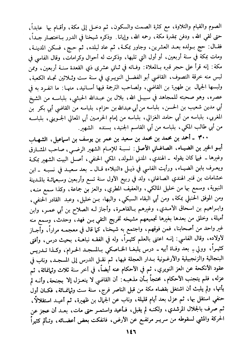 300 - أحمد بن محمد بن محمد بن سعيد بن عمر بن يوسف بن إسماعيل الشهاب أبو الخير بن الضياء الصاغاني الأصل نسبة للإمام الشهير الرضي صاحب المشارق وغيرها فيما كان يقوله الهندي المدني المولد المكي الحنفي أصل البيت الشهير بمكة ويعرف بابن الضياء ورأيت الفاسي في ذيل النبلاء قال بعد سعيد في نسبه ابن خشامات بن قنبر الهندي الصاغاني ولد في ربيع الأول سنة تسع وأربعين وسبعمائة بالمدينة النبوية وسمع بها من خليل المالكي والعفيف المطري والعز بن جماعة وكذا سمع منه ومن الموفق الحنبلي بمكة ومن أبي البقاء السبكي والبهاء بن خليل وعبد القادر الحنفي وإبراهيم بن إسحاق الآمدي وغيرهم بالقاهرة وأجاز له الصلاح بن أبي عمر وابن أميلة وخلق من بعدها بغيرها تجميعهم مشيخه تخريج التقي بن فهد وحدث وسمع منه غير واحد من أصحابنا فمن فوقهم واجتمع به شيخنا كما قال في معجمه مرارا وأجاز لأولاده وقال الفاسي إنه اعتنى بالعلم كثيرا وله في الفقه نباهة بحيث درس وأفتى كثيرا وولي بعد وفاة أبيه درس يلبغا الخاصكي بالمسجد الحرام وكذا تدريس البنجالية والزنجبيلية والأرغونية بدار العجلة فيها ثم نقل الدرس إلى المسجد وناب في عقود الأنكحة عن العز النويري ثم في الأحكام عنه أيضا في آخر سنة ثلاث وثمانمائة ثم عزله فلم يتجنب الأحكام محتجا بأن مذهبه أن القاضي لا ينعزل إلا بجنحة وأنه لم يأتها ولم يلبث أن اشتغل بقضاء مكة من قبل الناصر فرج سنة ست وثمانمائة فكان أول حنفي استقل بها ثم عزل بعد أيام قليلة وناب عن الجمال بن ظهيرة ثم أعيد استقلالا ثم صرف بالجلال المرشدي ولكنه لم يقبل فأعيد واستمر حتى مات بعد أن عجز عن الحركة والمشي لسقوطه من سرير مرتفع عن الأرض فانفكت بعض أعضائه وتألم كثيرا