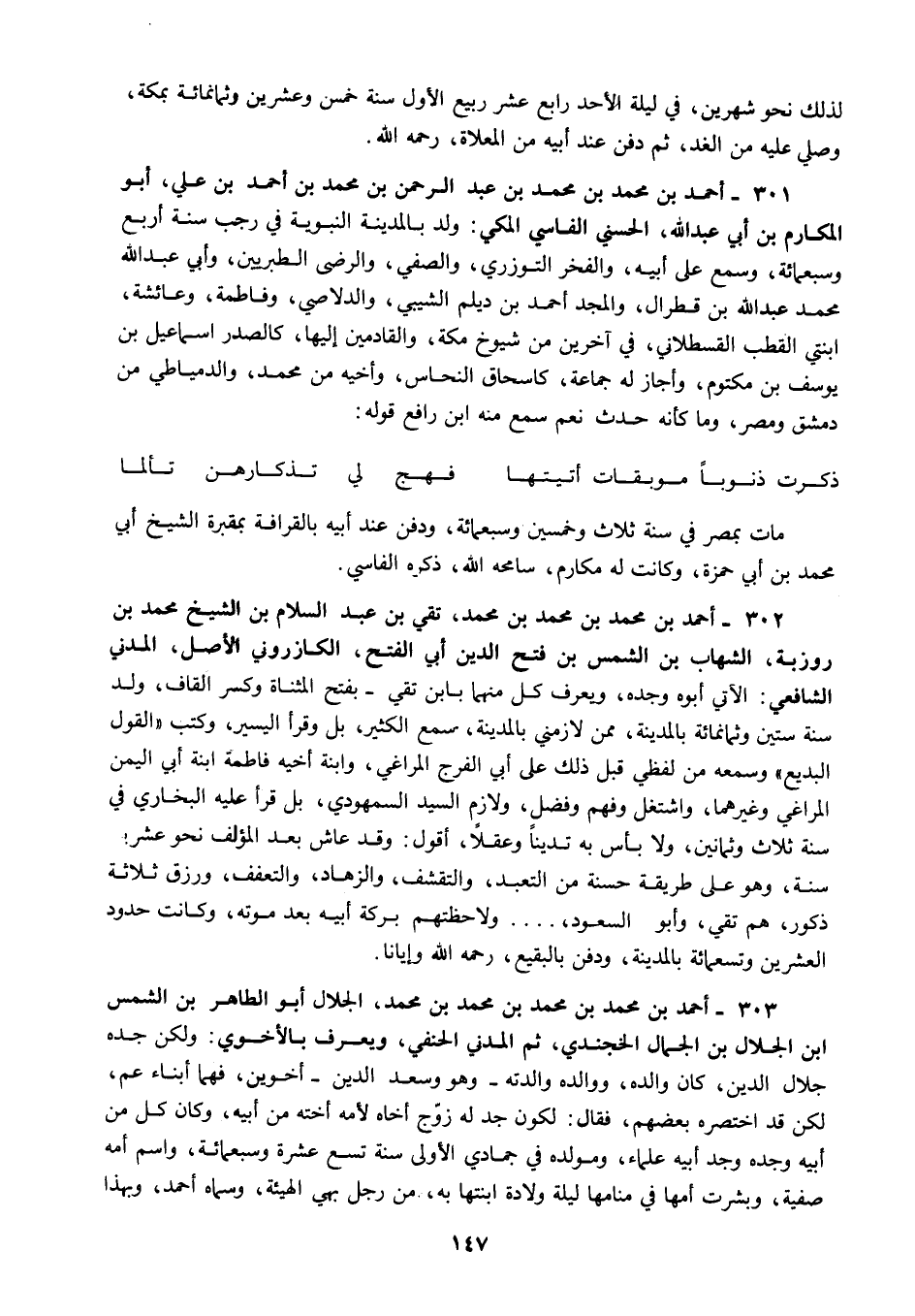 302 - أحمد بن محمد بن محمد بن محمد تقي بن عبد السلام بن الشيخ محمد بن روزبة الشهاب بن الشمس بن فتح الدين أبي الفتح الكازروني الأصل المدني الشافعي الآتي أبوه وجده ويعرف كل منهما بابن تقي بفتح المثناة وكسر القاف ولد سنة ستين وثمانمائة بالمدينة ممن لازمني بالمدينة سمع الكثير بل وقرأ اليسير وكتب القول البديع وسمعه من لفظي قبل ذلك على أبي الفرج المراغي وابنة أخيه فاطمة ابنة أبي اليمن المراغي وغيرهما واشتغل وفهم وفضل ولازم السيد السمهودي بل قرأ عليه البخاري في سنة ثلاث وثمانين ولا بأس به تدينا وعقلا أقول وقد عاش بعد المؤلف نحو عشرين سنة وهو على طريقة حسنة من التعبد والتقشف والزهاد والتعفف ورزق ثلاثة ذكور هم تقي وأبو السعود ولاحظتهم بركة أبيه بعد موته وكانت حدود العشرين وتسعمائة بالمدينة ودفن بالبقيع رحمه الله وإيانا.