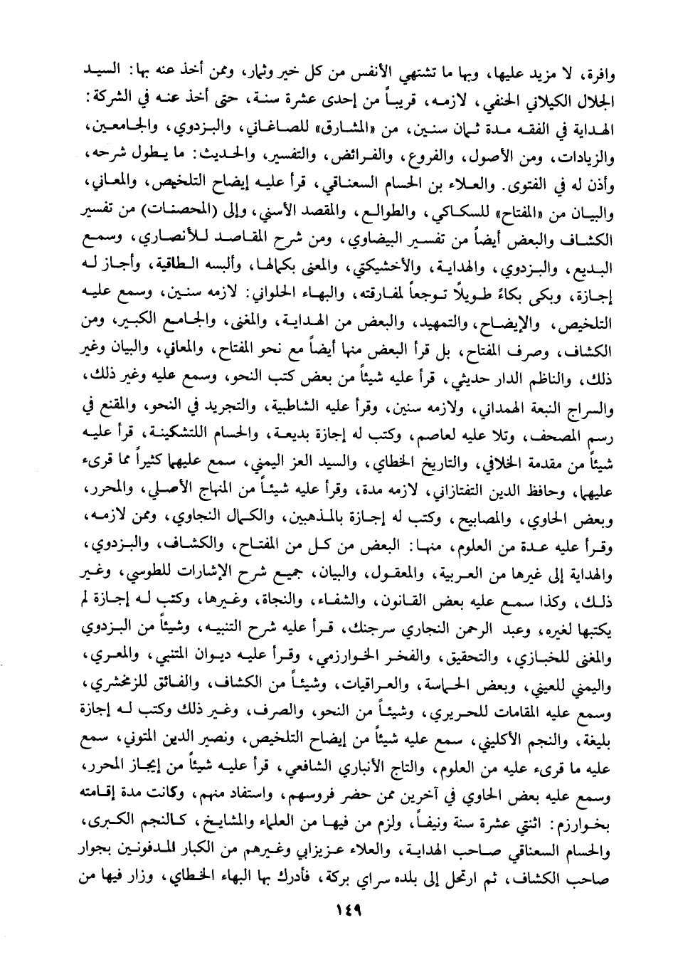 وافرة لا مزيد عليها وبها ما تشتهي الأنفس من كل خير وثمار وممن أخذ عنه بها السيد الجلال الكيلاني الحنفي لازمه قريبا من إحدى عشرة سنة حتى أخذ عنه في الشركة الهداية في الفقه مدة ثمان سنين من المشارق للصاغاني والبزدوي والجامعين والزيادات ومن الأصول والفروع والفرائض والتفسير والحديث ما يطول شرحه وأذن له في الفتوى والعلاء بن الحسام السعناقي قرأ عليه إيضاح التلخيص والمعاني والبيان من المفتاح للسكاكي والطوالع والمقصد الأسني وإلى المحصنات من تفسير الكشاف والبعض أيضا من تفسير البيضاوي ومن شرح المقاصد للأنصاري وسمع البديع والبزدوي والهداية والأخشيكتي والمعنى بكمالها وألبسه الطاقية وأجاز له إجازة وبكى بكاء طويلا توجعا لمفارقته والبهاء الحلواني لازمه سنين وسمع عليه التلخيص والإيضاح والتمهيد والبعض من الهداية والمغنى والجامع الكبير ومن الكشاف وصرف المفتاح بل قرأ البعض منها أيضا مع نحو المفتاح والمعاني والبيان وغير ذلك والناظم الدار حديثي قرأ عليه شيئا من بعض كتب النحو وسمع عليه وغير ذلك والسراج النبعة الهمداني ولازمه سنين وقرأ عليه الشاطبية والتجريد في النحو والمقنع في رسم المصحف وتلا عليه لعاصم وكتب له إجازة بديعة والحسام اللتشكينة قرأ عليه شيئا من مقدمة الخلافي والتاريخ الخطاي والسيد العز اليمني سمع عليهما كثيرا مما قرىء عليهما وحافظ الدين التفتازاني لازمه مدة وقرأ عليه شيئا من المنهاج الأصلي والمحرر وبعض الحاوي والمصابيح وكتب له إجازة بالمذهبين والكمال النجاوي وممن لازمه وقرأ عليه عدة من العلوم منها البعض من كل من المفتاح والكشاف والبزدوي والهداية إلى غيرها من العربية والمعقول والبيان جميع شرح الإشارات للطوسي وغير ذلك وكذا سمع عليه بعض القانون والشفاء والنجاة وغيرها وكتب له إجازة لم يكتبها لغيره وعبد الرحمن النجاري سرجنك قرأ عليه شرح التنبيه وشيئا من البزدوي والمغنى للخبازي والتحقيق والفخر الخوارزمي وقرأ عليه ديوان المتنبي والمعري واليمني للعيني وبعض الحماسة والعراقيات وشيئا من الكشاف والفائق للزمخشري وسمع عليه المقامات للحريري وشيئا من النحو والصرف وغير ذلك وكتب له إجازة بليغة والنجم الأكليني سمع عليه من شيئا إيضاح التلخيص ونصير الدين المتوني سمع عليه ما قرىء من العلوم والتاج الأنباري الشافعي قرأ عليه شيئا من إيجاز المحرر وسمع عليه بعض الحاوي في آخرين ممن حضر فروسهم واستفاد منهم وكانت مدة إقامته بخوارزم اثنتي عشرة سنة ونيفا ولزم من فيها من العلماء والمشايخ كالنجم الكبرى والحسام السعناقي صاحب الهداية والعلاء عزيزابي وغيرهم من الكبار المدفونين بجوار صاحب الكشاف ثم ارتحل إلى بلده سراي بركة فأدرك بها البهاء الخطاي وزار فيها من