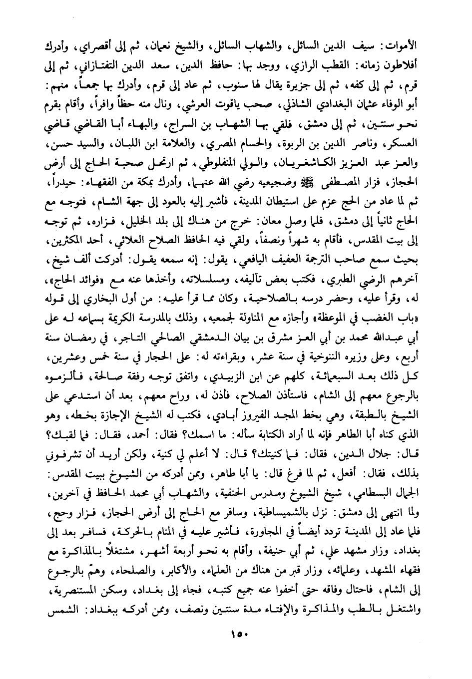الأموات سيف الدين السائل والشهاب السائل والشيخ نعمان ثم إلى أقصراي وأدرك أفلاطون زمانه القطب الرازي ووجد بها حافظ الدين سعد الدين التفتازاني ثم إلى قرم ثم إلى كفه ثم إلى جزيرة يقال لها سنوب ثم عاد إلى قرم وأدرك بها جمعا منهم أبو الوفاء عثمان البغدادي الشاذلي صحب ياقوت العرشي ونال منه حظا وافرا وأقام بقرم نحو سنتين ثم إلى دمشق فلقي بها الشهاب بن السراج والبهاء أبا القاضي قاضي العسكر وناصر الدين بن الربوة والحسام المصري والعلامة ابن اللبان والسيد حسن والعز عبد العزيز الكاشغريان والولي المنفلوطي ثم ارتحل صحبة الحاج إلى أرض الحجاز فزار المصطفى صلى الله عليه وسلم وضجيعيه رضي الله عنهما وأدرك بمكة من الفقهاء حيدرا ثم لما عاد من الحاج عزم على استيطان المدينة فأشير إليه بالعود إلى جهة الشام فتوجه مع الحاج ثانيا إلى دمشق فلما وصل معان خرج من هناك إلى بلد الخليل فزاره ثم توجه إلى بيت المقدس فأقام به شهرا ونصفا ولقي فيه الحافظ الصلاح العلائي أحد المكثرين بحيث سمع صاحب الترجمة العفيف اليافعي يقول إنه سمعته يقول أدركت ألف شيخ آخرهم الرضي الطبري فكتب بعض تآليفه ومسلسلاته وأخذها عنه مع فوائد الحاج له وقرأ عليه وحضر درسه بالصلاحية وكان مما قرأ عليه من أول البخاري إلى قوله باب الغضب في الموعظة وأجازه مع المناولة لجمعيه وذلك بالمدرسة الكريمة بسماعه له على أبي عبد الله محمد بن أبي العز مشرق بن بيان الدمشقي الصالحي التاجر في رمضان سنة أربع وعلى وزيره الننوخية في سنة عشر وبقراءته له على الحجار في سنة خمس وعشرين كل ذلك بعد السبعمائة كلهم عن ابن الزبيدي واتفق توجه رفقة صالحة فألزموه بالرجوع معهم إلى الشام فاستأذن الصلاح فأذن له وراح معهم بعد أن استدعي على الشيخ بالطبقة وهي بخط المجد الفيروز أبادي فكتب له الشيخ الإجازة بخطه وهو الذي كناه أبا الطاهر فإنه لما أراد الكتابة سأله ما اسمك فقال أحمد فقال فما لقبك قال جلال الدين فقال فما كنيتك؟ قال لا أعلم لي كنية ولكن أريد أن تشرفوني بذلك فقال أفعل ثم لما فرغ قال يا أبا طاهر وممن أدركه من الشيوخ ببيت المقدس الجمال البسطامي شيخ الشيوخ ومدرس الحنفية والشهاب أبي محمد الحافظ في آخرين ولما انتهى إلى دمشق نزل بالشميساطية وسافر مع الحاج إلى أرض الحجاز فزار وحج فلما عاد إلى المدينة تردد أيضا في المجاورة فأشير عليه في المنام بالحركة فسافر بعد إلى بغداد وزار مشهد علي ثم أبي حنيفة وأقام به نحو أربعة أشهر مشتغلا بالمذاكرة مع فقهاء المشهد وعلمائه وزار قبر من هناك من العلماء والأكابر والصلحاء وهم بالرجوع إلى الشام فاحتال وفاقه حتى أخفوا عنه جميع كتبه فجاء إلى بغداد وسكن المستنصية واشتغل بالطب والمذاكرة والإفتاء مدة سنتين ونصف وممن أدركه ببغداد: الشمس