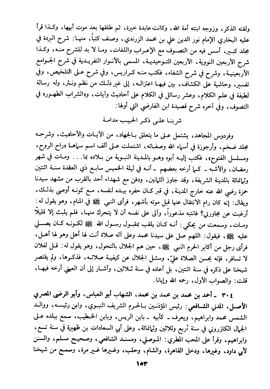 304 - أحمد بن محمد بن محمد بن محمد الشهاب أبو العباس وأبو الرضى المصري الأصل المدني الشافعي رئيس المؤذنين بالحرم الشريف النبوي وابن رئيسه ووالد الشمس محمد وإبراهيم ويعرف كأبيه بابن الريس وبابن الخطيب سمع ببلده على الجمال الكازروني في سنة أربع وثلاثين وثمانمائة وعلى أبي السعادات بن ظهيرة في سنة تسع وإبراهيم وقرأ على المحب المطري الموصلي ومسند الشافعي وصحيح مسلم والسنن لأبي داود وغيرها ودخل القاهرة والشام وحلب وغيرها غير مرة وسمع من شيخنا