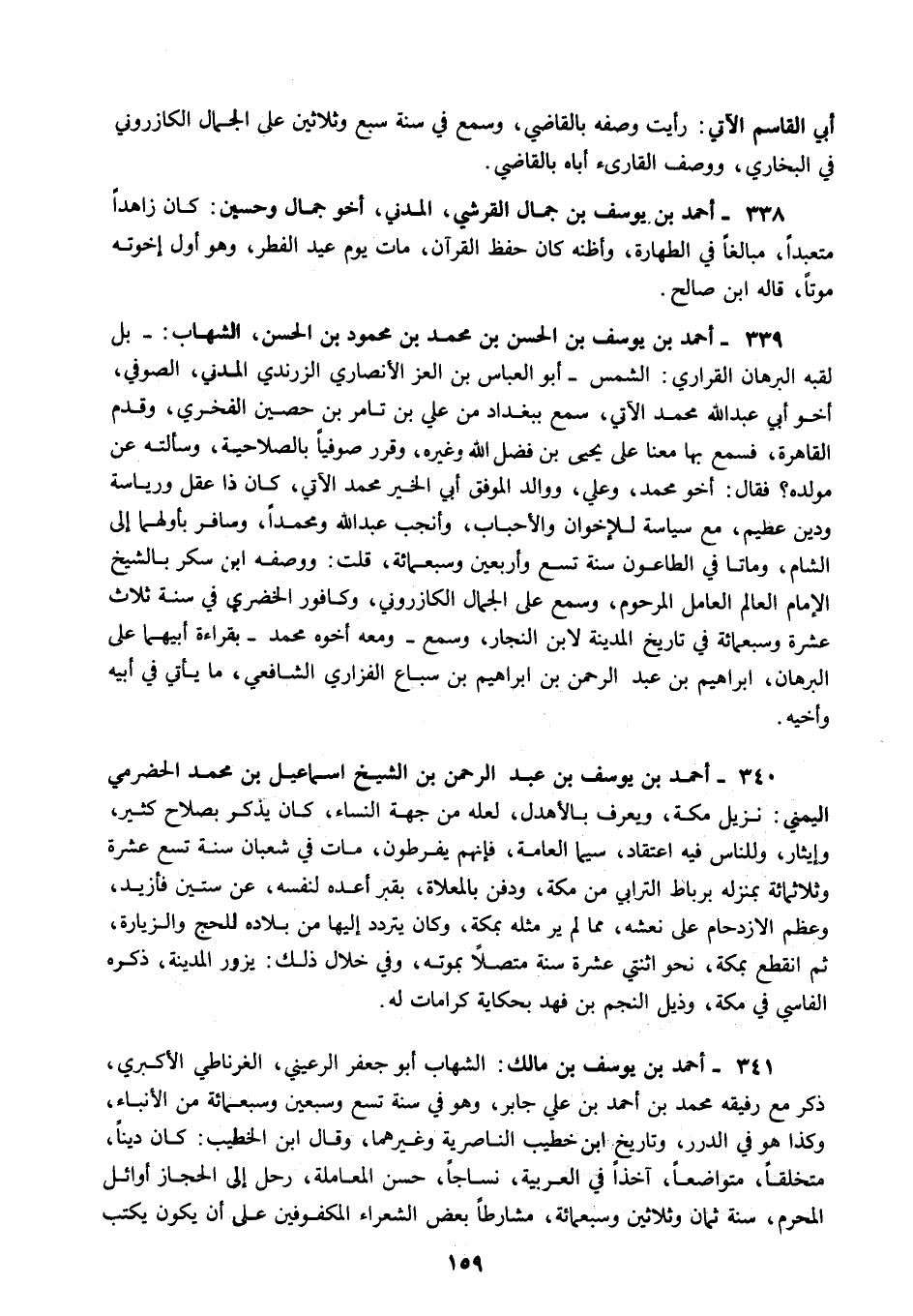 338 - أحمد بن يوسف بن جمال القرشي المدني أخو جمال وحسين كان زاهدا متعبدا مبالغا في الطهارة وأظنه كان حفظ القرآن مات يوم عيد الفطر وهو أول إخوته موتا قاله ابن صالح.