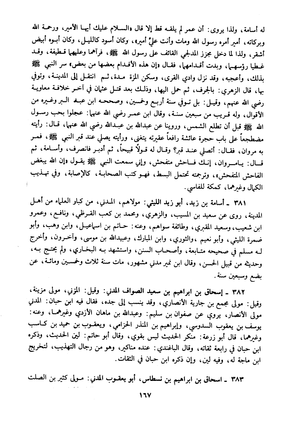 381 - أسامة بن زيد أبو زيد الليثي مولاهم المدني من كبار العلماء من أهل المدينة روى عن سعيد بن المسيب والزهري ومحمد بن كعب القرظي ونافع وعمرو ابن شعيب وسعيد المقبري وطائفة سواهم وعنه حاتم بن إسماعيل وابن وهب وأبو ضمرة الليثي وأبو نعيم والثوري وابن المبارك وعبيد الله بن موسى وآخرون وأخرج له مسلم في صحيحه متابعة وأصحاب السنن واستشهد به البخاري ولم يحتج به وحديثه من قبيل الحسن وقال ابن نمير مدني مشهور مات سنة ثلاث وخمسين ومائة عن بضع وسبعين سنة.