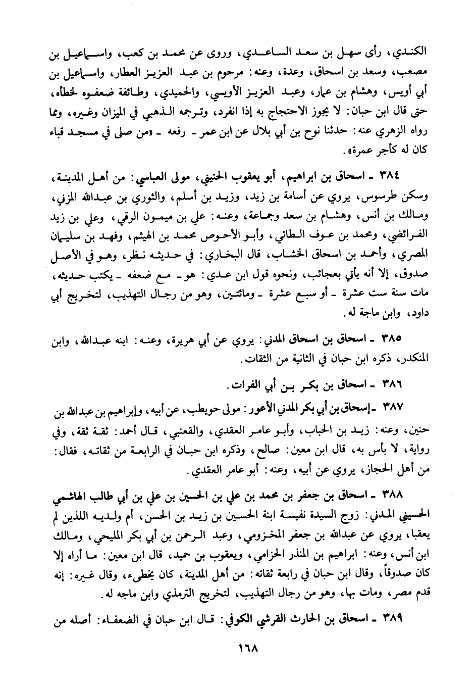 384 - إسحاق بن إبراهيم أبو يعقوب الحنيني مولى العباسي من أهل المدينة وسكن طرسوس يروي عن أسامة بن زيد وزيد بن أسلم والثوري بن عبد الله المزني ومالك بن أنس وهشام بن سعد وجماعة وعنه علي بن ميمون الرقي وعلي بن زيد الفرائضي ومحمد بن عوف الطائي وأبو الأحوص محمد بن الهيثم وفهد بن سليمان المصري وأحمد بن إسحاق الخشاب قال البخاري في حديثه نظر وهو في الأصل صدوق إلا إنه يأتي بعجائب ونحوه قول ابن عدي هو مع ضعفه يكتب حديثه مات سنة ست عشرة أو سبع عشرة ومائتين وهو من رجال التهذيب لتخريج أبي داود وابن ماجة له.