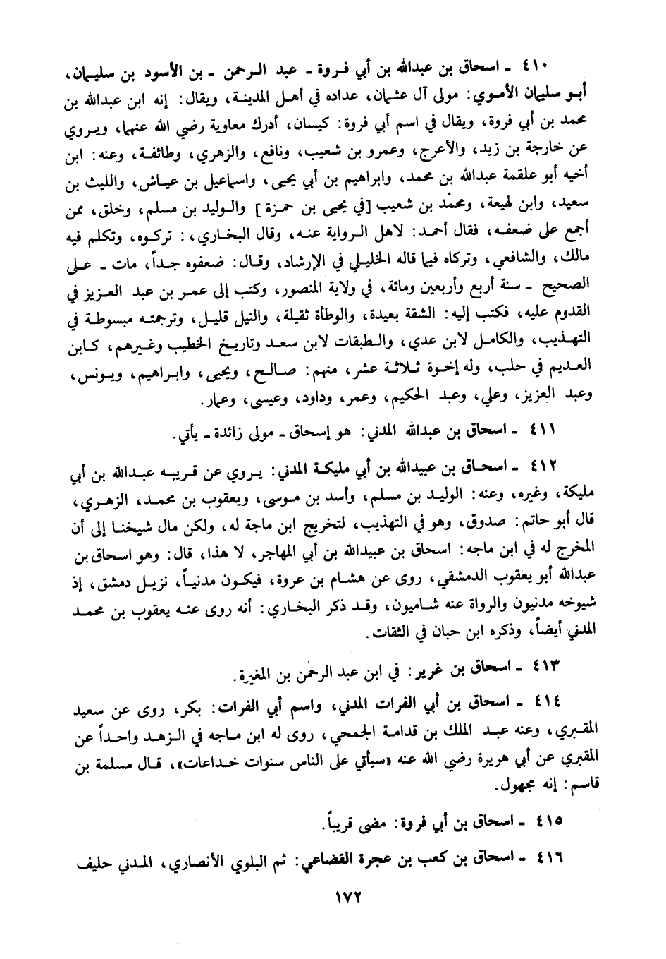 414 - إسحاق بن أبي الفرات المدني واسم أبي الفرات بكر روى عن سعيد المقبري وعنه عبد الملك بن قدامة الجمحي روى له ابن ماجه في الزهد واحدا عن المقبري عن أبي هريرة رضي الله عنه سيأتي على الناس سنوات خداعات قال مسلمة بن قاسم إنه مجهول.