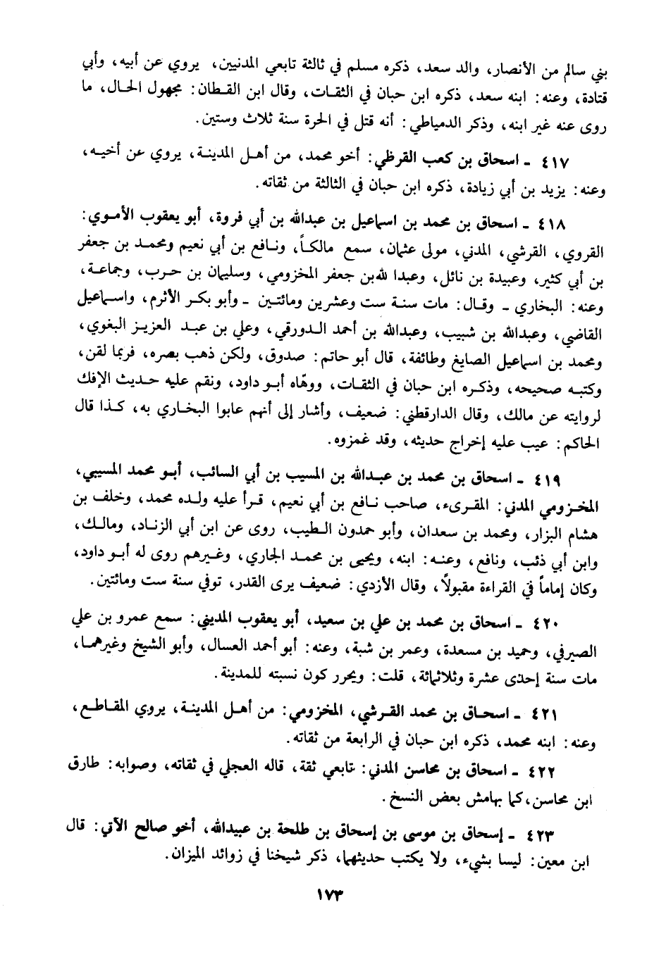 421 - إسحاق بن محمد القرشي المخزومي من أهل المدينة يروي المقاطع وعنه ابنه محمد ذكره ابن حبان في الرابعة من ثقاته.