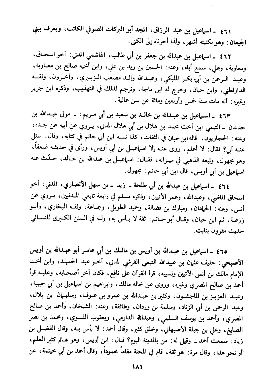 465 - إسماعيل بن عبد الله بن أويس بن مالك بن أبي عامر أبو عبد الله بن أويس الأصبحي حليف عثمان بن عبيد الله التيمي القرشي المدني أخو عبد الحميد وابن أخت الإمام مالك بن أنس الآتيين ونسيبه قرأ القرآن على نافع فكان آخر أصحابه وعليه قرأ أحمد بن صالح المصري وغيره وروى عن خاله مالك وإبراهيم بن إسماعيل بن أبي حبيبة وعبد العزيز بن الماجشون وكثير بن عبد الله بن عمرو بن عوف وسليمان بن بلال وعبد الرحمن بن أبي الزناد وسلمة بن وردان وطائفة وعنه الشيخان وأحمد بن صالح المصري وأحمد بن يوسف السلمي وعبد الله الدارمي ويعقوب الفسوي ومحمد بن نصر الصايغ وعلي بن جبلة الأصبهاني وخلق كثير وقال أحمد لا بأس به وقال الفضل بن زياد سمعت أحمد وقيل له من بالمدينة اليوم؟ قال ابن أويس وهو عالم كثير العلم أو نحو هذا وقال مرة هو ثقة قام في المحنة مقاما محمودا وقال أحمد بن أبي خيثمة عن
