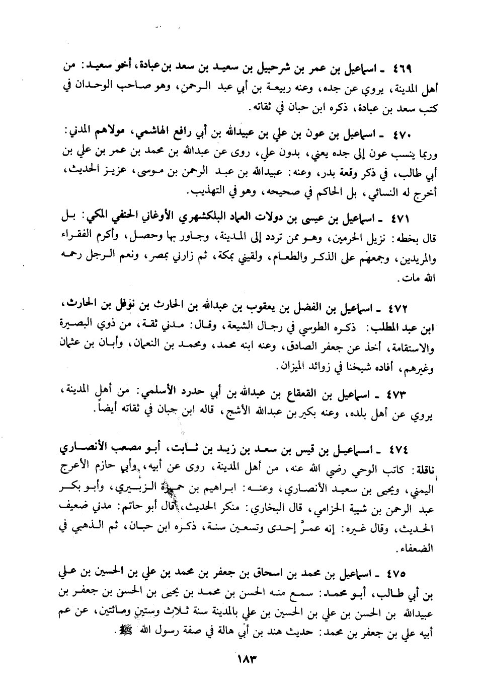469 - إسماعيل بن عمر بن شرحبيل بن سعيد بن سعد بن عبادة أخو سعيد من أهل المدينة يروي عن جده وعنه ربيعة بن أبي عبد الرحمن وهو صاحب الوحدان في كتب سعد بن عبادة ذكره ابن حبان في ثقاته.