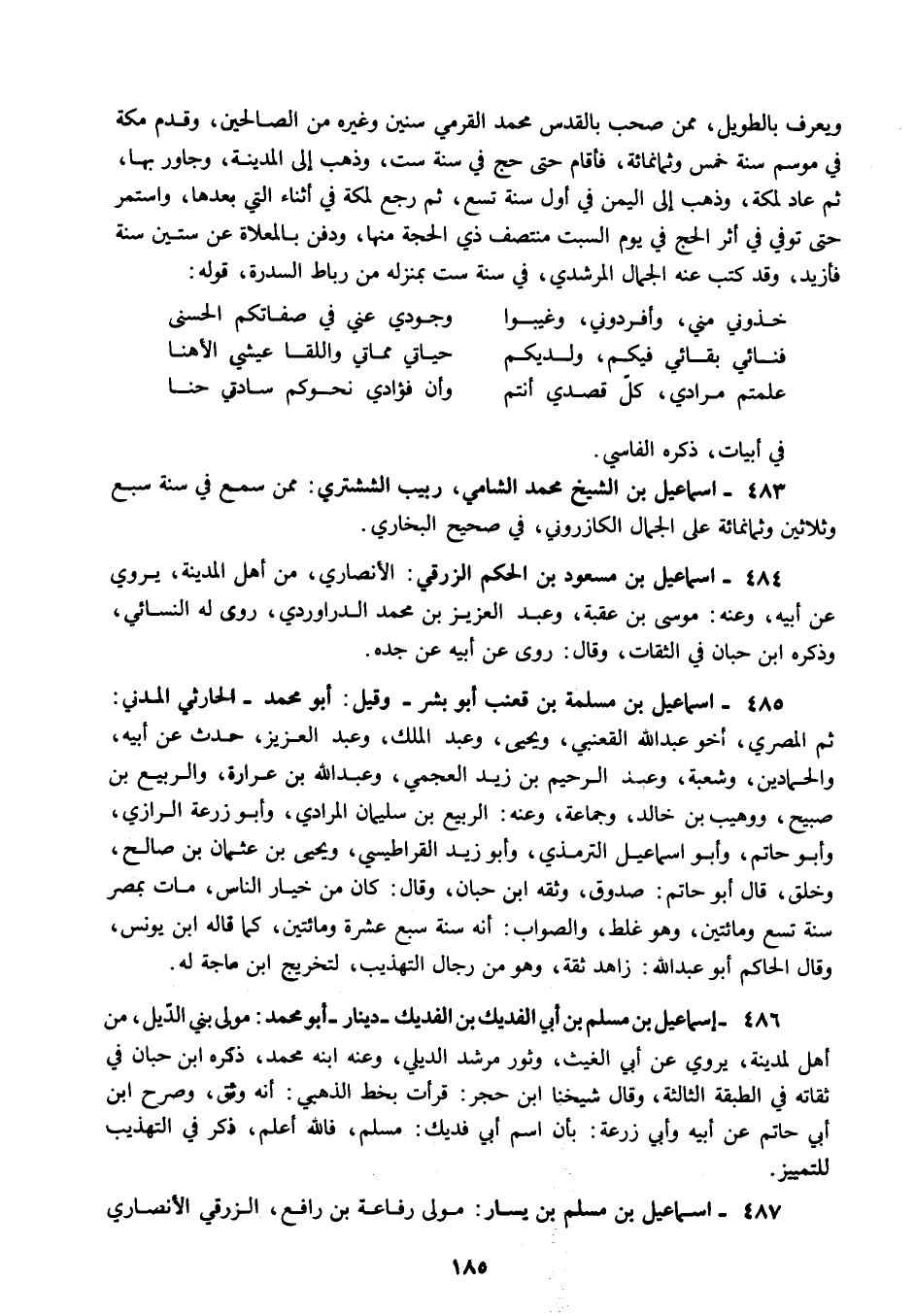 484 - إسماعيل بن مسعود بن الحكم الزرقي الأنصاري من أهل المدينة يروي عن أبيه وعنه موسى بن عقبة وعبد العزيز بن محمد الدراوردي روى له النسائي وذكره ابن حبان في الثقات وقال روى عن أبيه عن جده