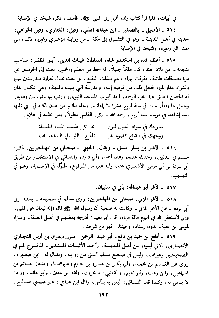 515 - أعظم شاه بن اسكندر شاه السلطان غياث الدين أبو المظفر صاحب بنجاله من بلاد الهند كان ملكا جليلا له حظ من العلم والخير بعث إلى الحرمين غير مرة بصدقات طائلة ففرقت بهما وعم بذلك النفع بل بعث بمال لعمارة مدرستين بهما ولشراء عقار لهما ففعل ذلك من فوضه إليه والمدرسة التي بنيت بالمدينة وهي بمكان يقال له الحصن العتيق عند باب الرحمة أحد أبواب المسجد النبوي ورتب بها مدرستين وطلبة وجعل لها وقفا مات في سنة أربع عشرة وثمانمائة وجاء الخبر من عدن لمكة في التي تليها بعد إشاعته في موسم سنة أربع رحمه الله ذكره الفاسي مطولا ومن نظمه في غلام: