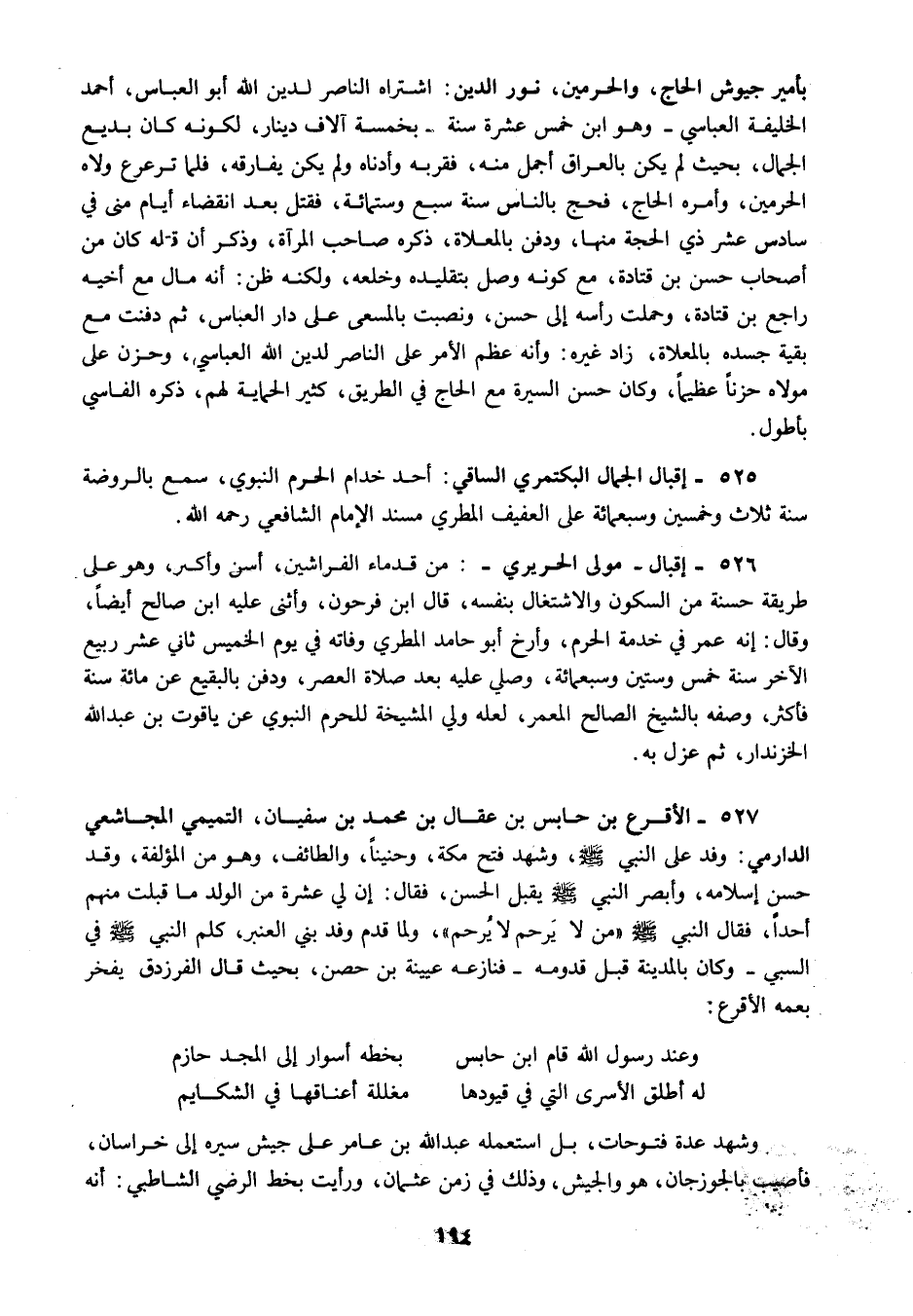 526 - إقبال مولى الحريري من قدماء الفراشين أسن وأكبر وهو على طريقة حسنة من السكون والاشتغال بنفسه قال ابن فرحون وأثنى عليه ابن صالح أيضا وقال إنه عمر في خدمة الحرم وأرخ أبو حامد المطري وفاته في يوم الخميس ثاني عشر ربيع الآخر سنة خمس وستين وسبعمائة وصلي عليه بعد صلاة العصر ودفن بالبقيع عن مائة سنة فأكثر وصفه بالشيخ الصالح المعمر لعله ولي المشيخة للحرم النبوي عن ياقوت بن عبد الله الخزندار ثم عزل به.