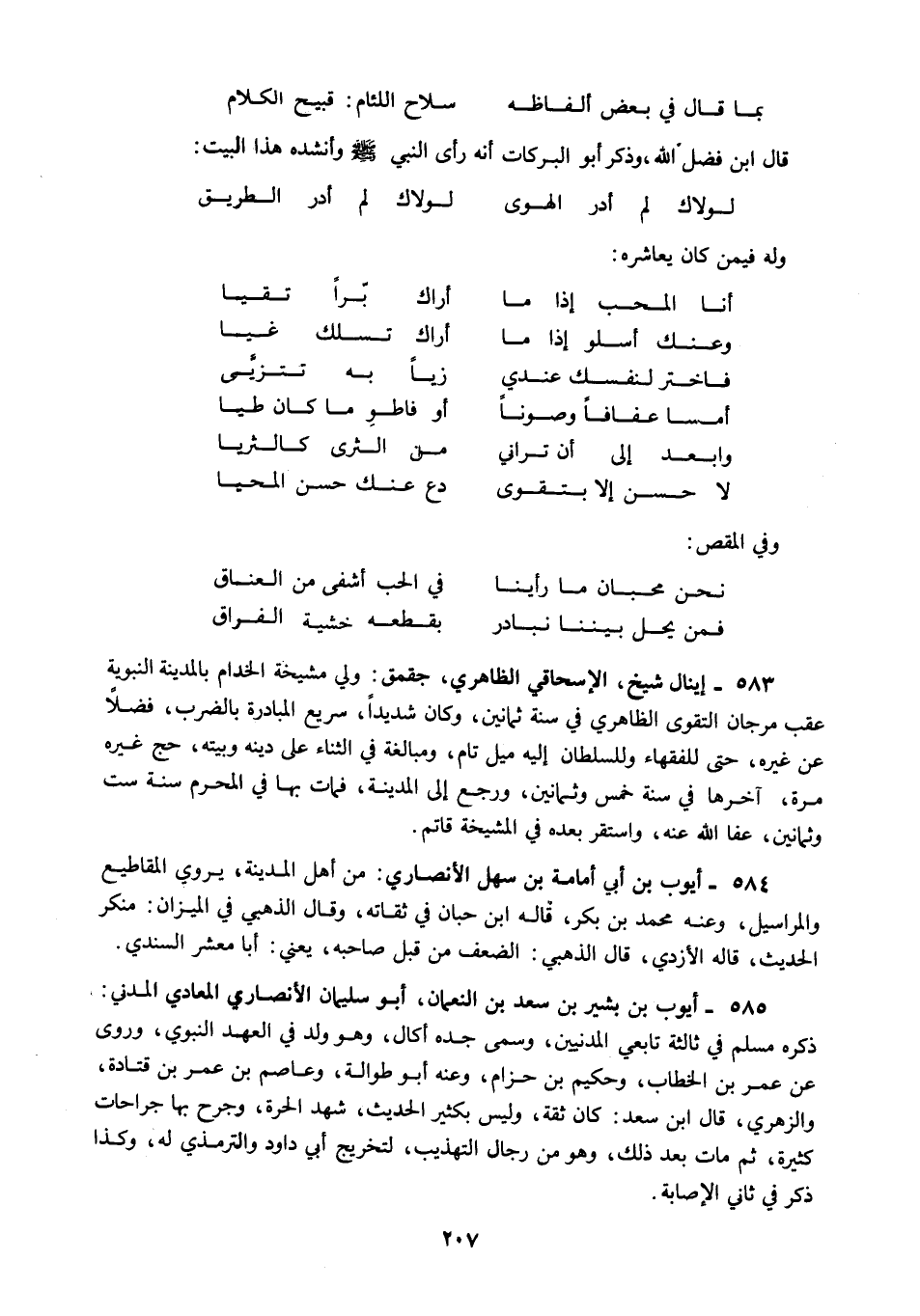584 - أيوب بن أبي أمامة بن سهل الأنصاري من أهل المدينة يروي المقاطيع والمراسيل وعنه محمد بن بكر قاله ابن حبان في ثقاته وقال الذهبي في الميزان منكر الحديث قاله الأزدي قال الذهبي الضعف من قبل صاحبه يعني أبا معشر السندي
