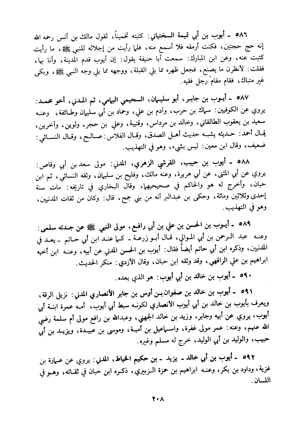 586 - أيوب بن أبي تميمة السختياني كتبته تخمينا لقول مالك بن أنس رحمه الله إنه حج حجتين فكنت أرمقه فلا أسمع منه فلما رأيت من إجلاله للنبي صلى الله عليه وسلم ما رأيت كتبت عنه وعن ابن المبارك سمعت أبا حنيفة يقول إن أيوب قدم المدينة وأنا بها فقلت لأنظرن ما يصنع فجعل ظهره مما يلي القبلة ووجهه مما يلي وجه النبي صلى الله عليه وسلم وبكى غير متباك فقام مقام رجل فقيه.