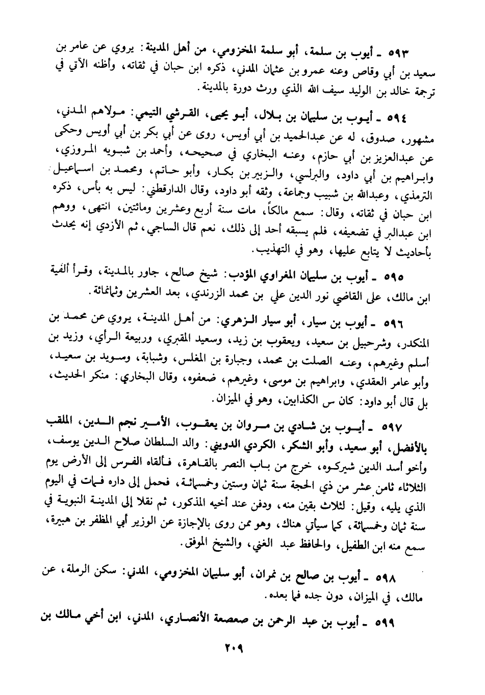 594 - أيوب بن سليمان بن بلال أبو يحيى القرشي التيمي مولاهم المدني مشهور صدوق له عن عبد الحميد بن أبي أويس روى عن أبي بكر بن أبي أويس وحكى عن عبد العزيز بن أبي حازم وعنه البخاري في صحيحه وأحمد بن شبويه المروزي وإبراهيم بن أبي داود والبرلسي والزبير بن بكار وأبو حاتم ومحمد بن إسماعيل الترمذي وعبد الله بن شبيب وجماعة وثقه أبو داود وقال الدارقطني ليس به بأس ذكره ابن حبان في ثقاته وقال سمع مالكا مات سنة أربع وعشرين ومائتين انتهى ووهم ابن عبد البر في تضعيفه فلم يسبقه أحد إلى ذلك نعم قال الساجي ثم الأزدي إنه يحدث بأحاديث لا يتابع عليها وهو في التهذيب.