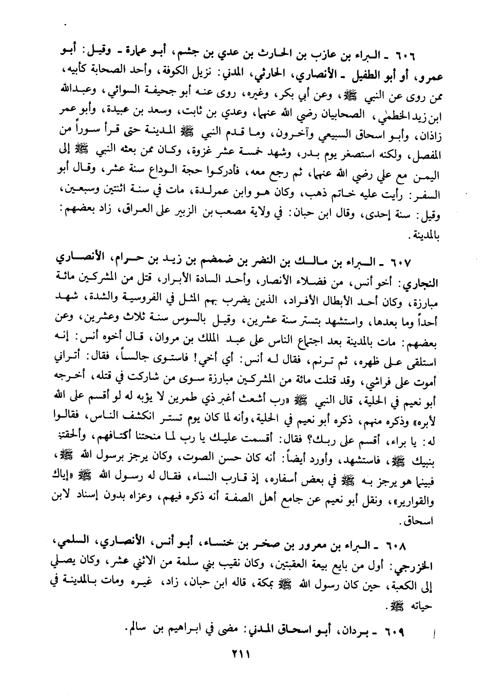 606 - البراء بن عازب بن الحارث بن عدي بن جشم أبو عمارة وقيل أبو عمرو أو أبو الطفيل الأنصاري الحارثي المدني نزيل الكوفة وأحد الصحابة كأبيه ممن روى عن النبي صلى الله عليه وسلم وعن أبي بكر وغيره روى عنه أبو جحيفة السوائي وعبد الله ابن زيد الخطمي الصحابيان رضي الله عنهما وعدي بن ثابت وسعد بن عبيدة وأبو عمر زاذان وأبو إسحاق السبيعي وآخرون وما قدم النبي صلى الله عليه وسلم المدينة حتى قرأ سورا من المفصل ولكنه استصغر يوم بدر وشهد خمسة عشر غزوة وكان ممن بعثه النبي صلى الله عليه وسلم إلى اليمن مع علي رضي الله عنهما ثم رجع معه فأدركوا حجة الوداع سنة عشر وقال أبو السفر رأيت عليه خاتم ذهب وكان هو وابن عمر لدة مات في سنة اثنتين وسبعين وقيل سنة إحدى وقال ابن حبان في ولاية مصعب بن الزبير على العراق زاد بعضهم بالمدينة.