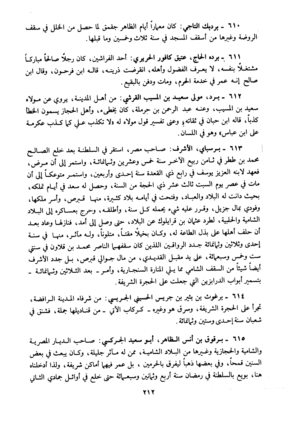 615 - برقوق بن أنس الظاهر أبو سعيد الجركسي صاحب الديار المصرية والشامية والحجازية وغيرها من البلاد الشامية ممن له مآثر جليلة وكان يبعث في بعض السنين قمحا وفي بعضها ذهبا ليفرق بالحرمين بل عمر فيهما أماكن شريفة ولذا أدخلناه هنا بويع بالسلطنة في رمضان سنة أربع وثمانين وسبعمائة حتى خلع في أوائل جمادي الثاني