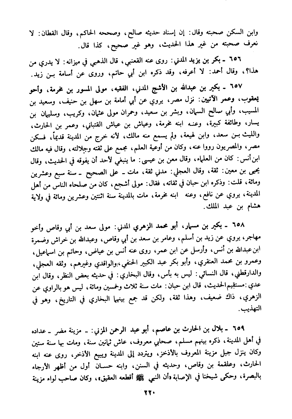657 - بكير بن عبد الله بن الأشج المدني الفقيه مولى المسور بن مخرمة وأخو يعقوب وعمر الآتيين نزل مصر يروي عن أبي أمامة بن سهل بن حنيف وسعيد بن المسيب وأبي صالح السمان وبشر بن سعيد وحمران مولى عثمان وكريب وسليمان بن يسار وطائفة كبيرة وعنه ابنه مخرمة وعياش بو عياش القتباني وعمر بن الحارث والليث بن سعد وابن لهيعة ولم يسمع منه مالك لأنه خرج من المدينة قديما فسكن مصر والمصريون رووا عنه وكان من أوعية العلم مجمع على ثقته وجلالته وقال فيه مالك ابن أنس كان من العلماء وقال معن بن عيسى ما ينبغي لأحد أن يفوقه في الحديث وقال يحيى بن معين ثقة وقال العجلي مدني ثقة مات على الصحيح سنة سبع وعشرين ومائة قلت وذكره ابن حبان في ثقاته فقال مولى أشجع كان من صلحاء الناس من أهل المدينة يروي عن نافع وعنه ابنه مخرمة مات بالمدينة سنة اثنتين وعشرين ومائة في ولاية هشام بن عبد الملك.