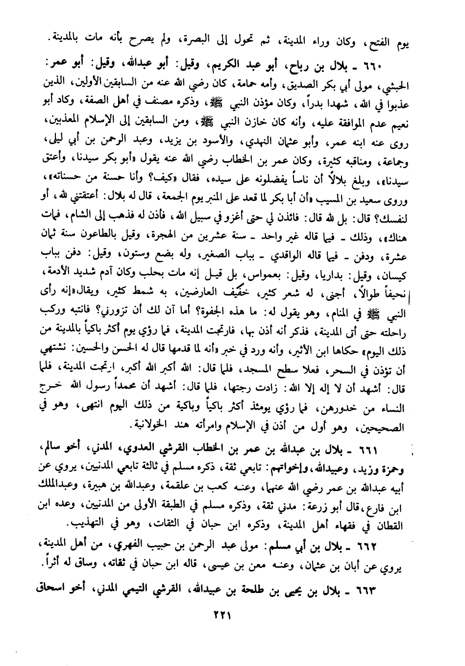 661 - بلال بن عبد الله بن عمر بن الخطاب القرشي العدوي المدني أخو سالم وحمزة وزيد وعبيد الله وإخواتهم تابعي ثقة ذكره مسلم في ثالثة تابعي المدنيين يروي عن أبيه عبد الله بن عمر رضي الله عنهما وعنه كعب بن علقمة وعبد الله بن هبيرة وعبد الملك ابن فارع قال أبو زرعة مدني ثقة وذكره مسلم في الطبقة الأولى من المدنيين وعده ابن القطان في فقهاء أهل المدينة وذكره ابن حبان في الثقات وهو في التهذيب.