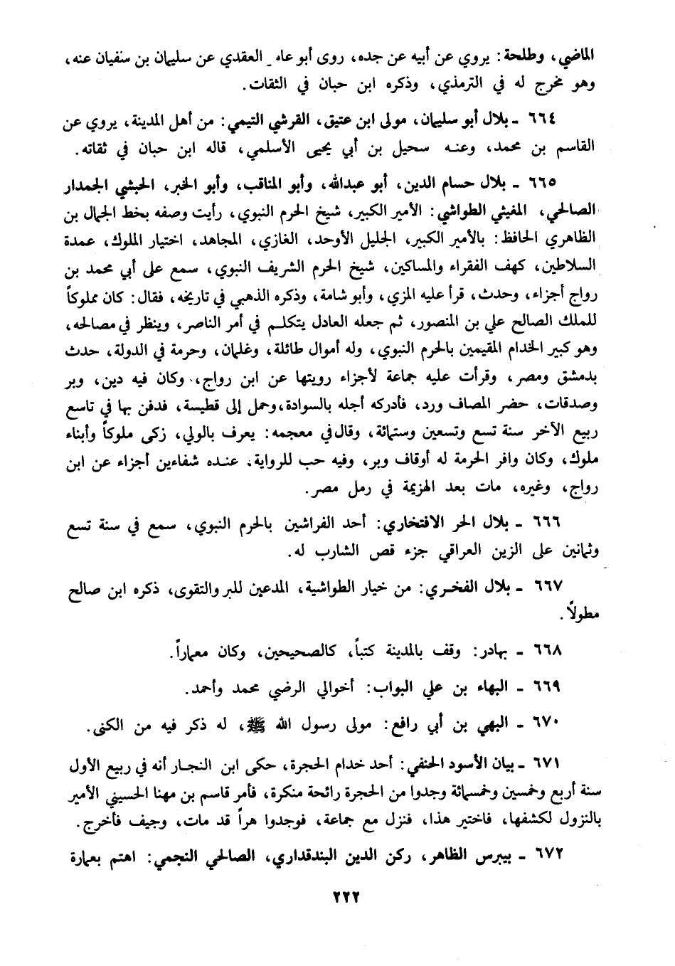 665 - بلال حسام الدين أبو عبد الله وأبو المناقب وأبو الخبر الحبشي الجمدار الصالحي المغيثي الطواشي الأمير الكبير شيخ الحرم النبوي رأيت وصفه بخط الجمال بن الظاهري الحافظ بالأمير الكبير الجليل الأوحد الغازي المجاهد اختيار الملوك عمدة السلاطين كهف الفقراء والمساكين شيخ الحرم الشريف النبوي سمع على أبي محمد بن رواج أجزاء وحدث قرأ عليه المزي وأبو شامة وذكره الذهبي في تاريخه فقال كان مملوكا للملك الصالح علي بن المنصور ثم جعله العادل يتكلم في أمر الناصر وينظر في مصالحه وهو كبير الخدام المقيمين بالحرم النبوي وله أموال طائلة وغلمان وحرمة في الدولة حدث بدمشق ومصر وقرأت عليه جماعة لأجزاء رويتها عن ابن رواج وكان فيه دين وبر وصدقات حضر المصاف ورد فأدركه أجله بالسوادة وحمل إلى قطيسة فدفن بها في تاسع ربيع الآخر سنة تسع وتسعين وستمائة وقال في معجمه يعرف بالولي زكى ملوكا وأبناء ملوك وكان وافر الحرمة له أوقاف وبر وفيه حب للرواية عنده شفاءين أجزاء عن ابن رواج وغيره مات بعد الهزيمة في رمل مصر.