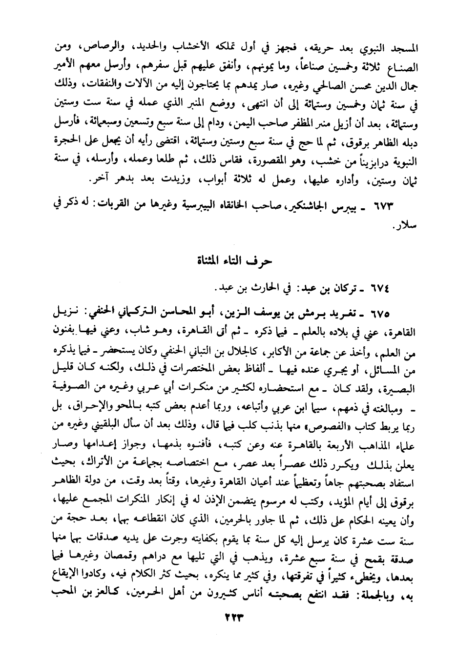 675 - تغريد برمش بن يوسف الزين أبو المحاسن التركماني الحنفي نزيل القاهرة عني في بلاده بالعلم فيما ذكره ثم أتى القاهرة وهو شاب وعني فيها بفنون من العلم وأخذ عن جماعة من الأكابر كالجلال بن التباني الحنفي وكان يستحضر فيما يذكره من المسائل أو يجري عنده فيها ألفاظ بعض المختصرات في ذلك ولكنه كان قليل البصيرة ولقد كان مع استحضاره لكثير من منكرات أبي عربي وغيره من الصوفية ومبالغته في ذمهم سيما ابن عربي وأتباعه وربما أعدم بعض كتبه بالمحو والإحراق بل ربما يربط كتاب الفصوص منها بذنب كلب فيما قال وذلك بعد أن سأل البلقيني وغيره من علماء المذاهب الأربعة بالقاهرة عنه وعن كتبه فأفنوه بذمها وجواز إعدامها وصار يعلن بذلك ويكرر ذلك عصرا بعد عصر مع اختصاصه بجماعة من الأتراك بحيث استفاد بصحبتهم جاها وتعظيما عند أعيان القاهرة وغيرها وقتا بعد وقت من دولة الظاهر برقوق إلى أيام المؤيد وكتب له مرسوم يتضمن الإذن له في إنكار المنكرات المجمع عليها وأن يعينه الحكام على ذلك ثم لما جاور بالحرمين الذي كان انقطاعه بهما بعد حجة من سنة ست عشرة كان يرسل إليه كل سنة بما يقوم بكفايته وجرت على يديه صدقات بهما منها صدقة بقمح في سنة سبع عشرة ويذهب في التي تليها مع دراهم وقمصان وغيرها فيما بعدها ويخطىء كثيرا في تفرقتها وفي كثير مما ينكره بحيث كثر الكلام فيه وكادوا الإيقاع به وبالجملة فقد انتفع بصحبته أناس كثيرون من أهل الحرمين كالعز بن المحب