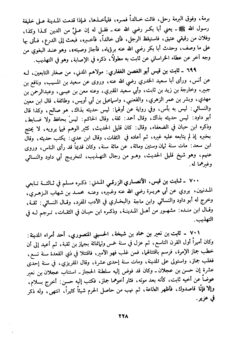 700 - ثابت بن قيس الأنصاري الزرقي المدني ذكره مسلم في ثالثة تابعي المدنيين يروي عن أبي هريرة رضي الله عنه وغيره وعنه محمد بن شهاب الزهري وخرج له أبو داود والنسائي وابن ماجة والبخاري في الأدب المفرد وقال النسائي ثقة وقال ابن منده مشهور من أهل المدينة وذكره ابن حبان في الثقات ترجم له في التهذيب.